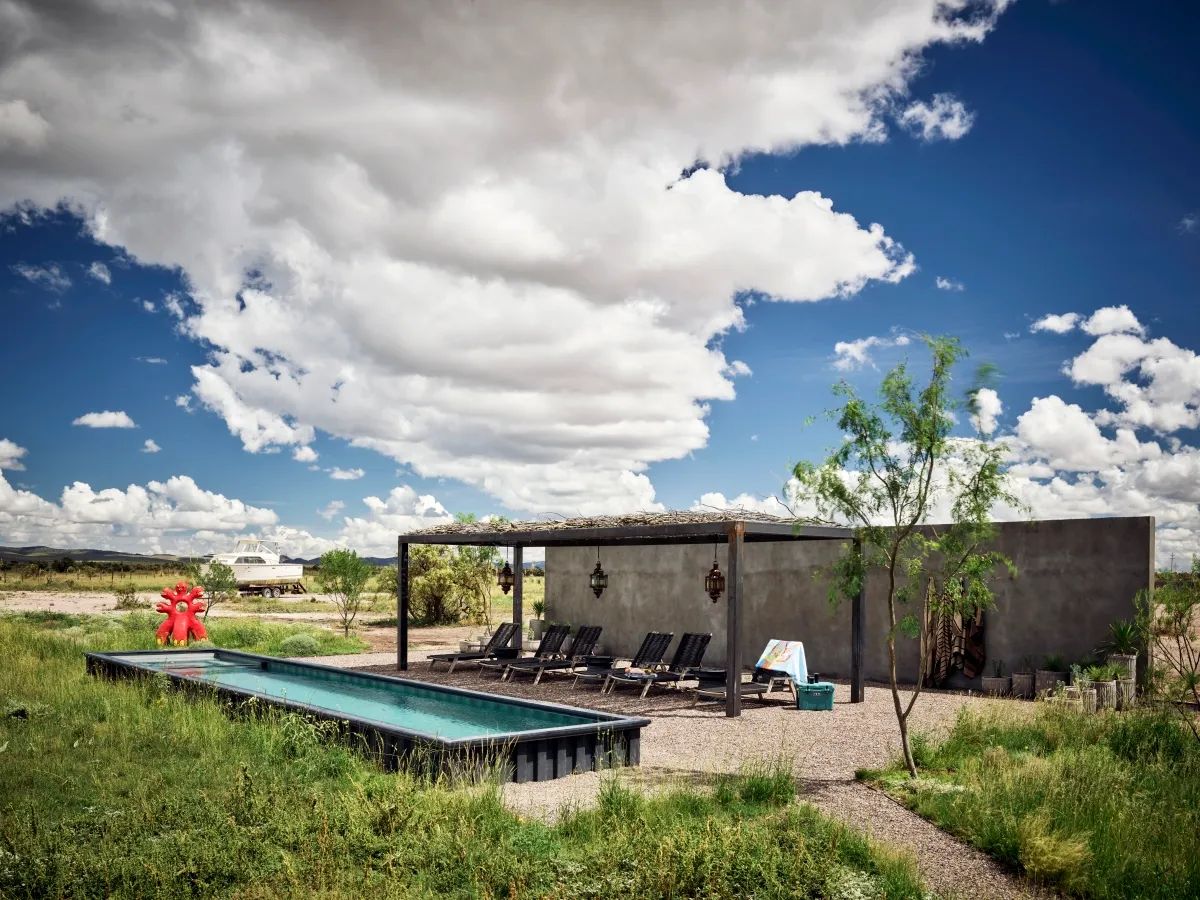 Kompanija Modpools, koju je 2017. osnovao Pol Ratnam, transformiše korišćene kontejnere u prilagođene modularne bazene kao što je ovaj, koji pravi društvo skulpturi Breta Daglasa Hantera u kompleksu fotografa Daglasa Fridmana u Marfiju u Teksasu.