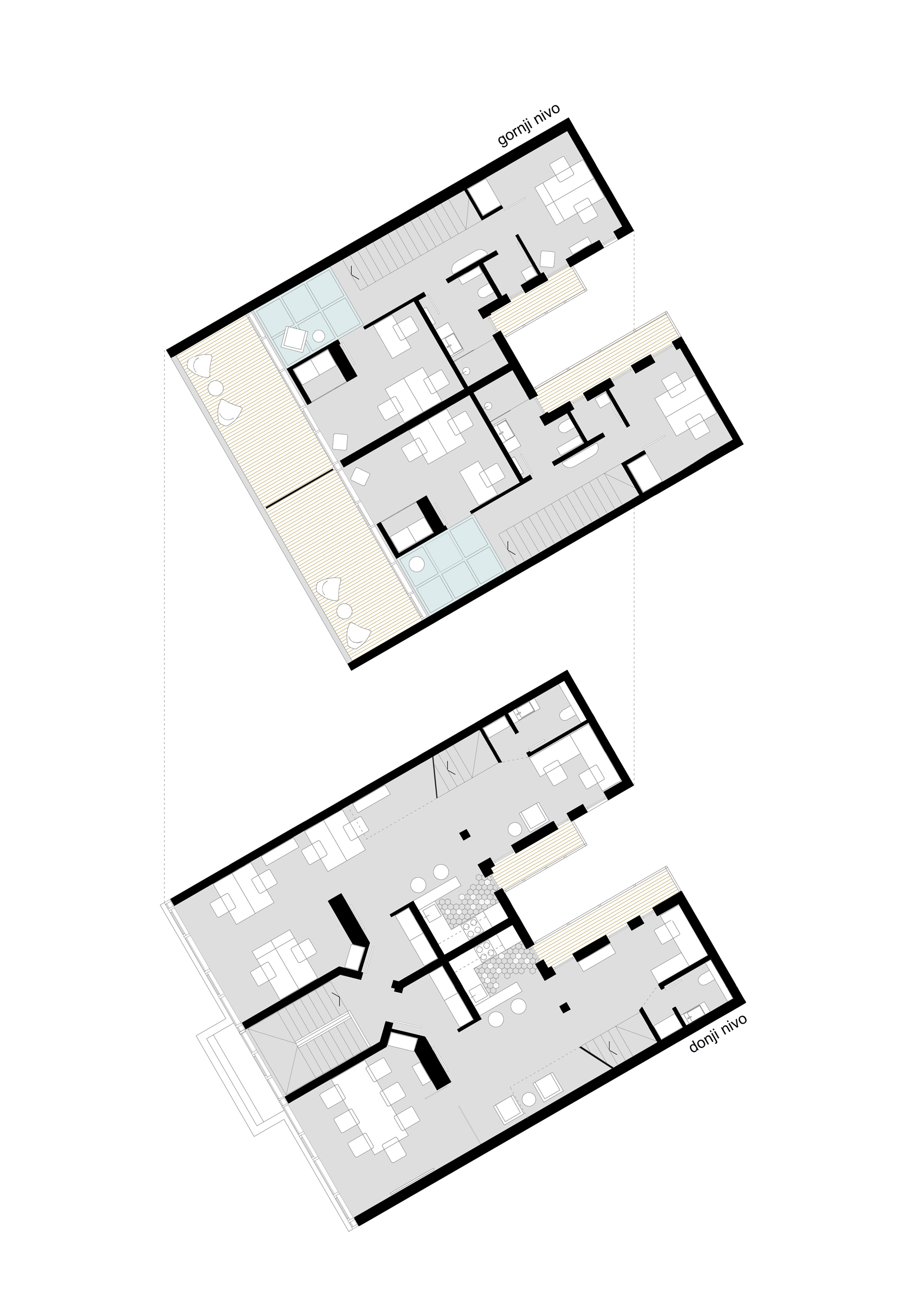Gornji nivoi su organizovani kao intimniji prostor sa više soba koje su preko hodnika povezani sa prostranom uličnom terasom.