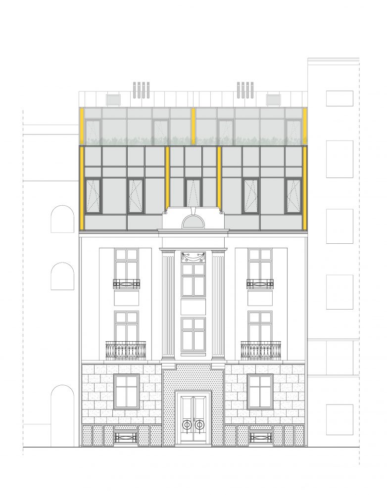 Ulična fasada objekta koji je bio predmet nadgradnje izgrađena je u duhu akademizma, a novoizgrađeni volumen se oblikovno i materijalizacijski diferencira u odnosu na postojeći deo i rešen je kroz autorski izraz u savremenom duhu i uz upotrebu savremenih materijala.