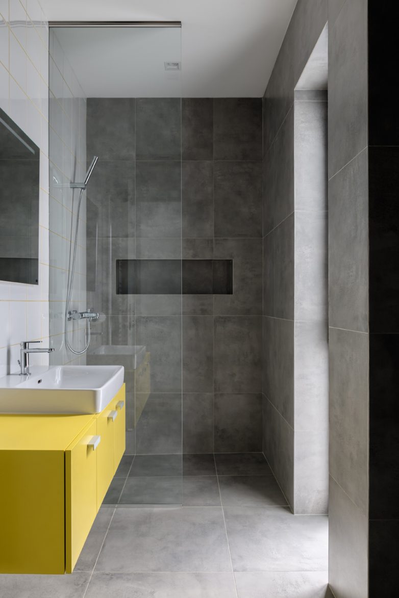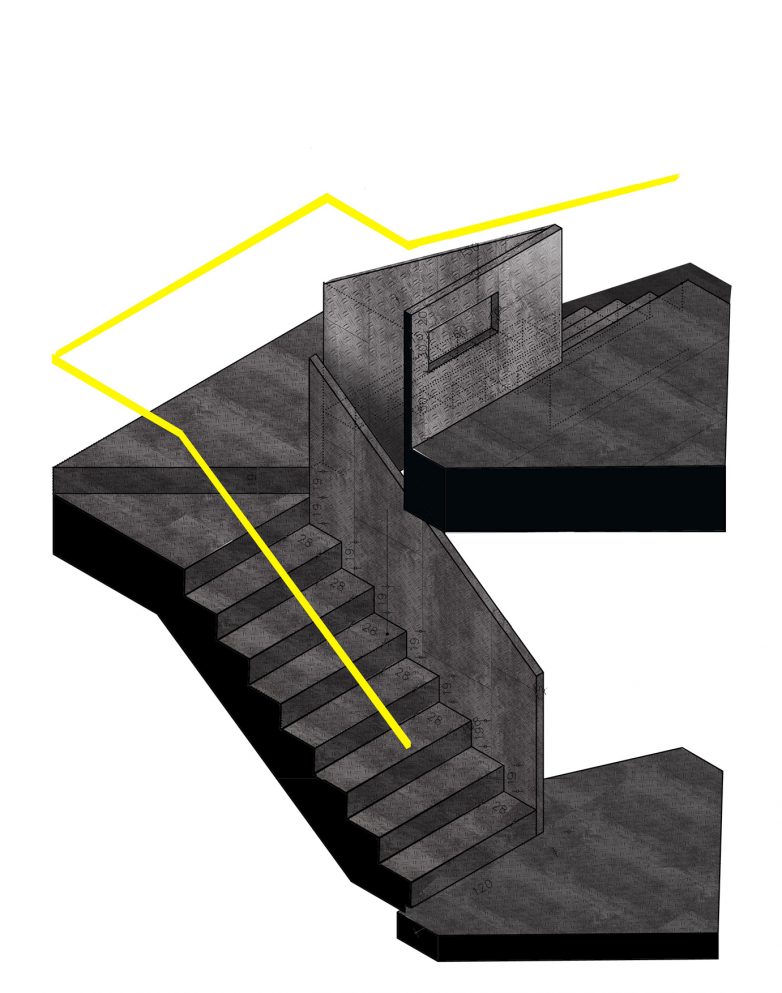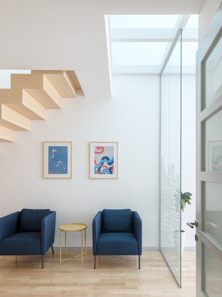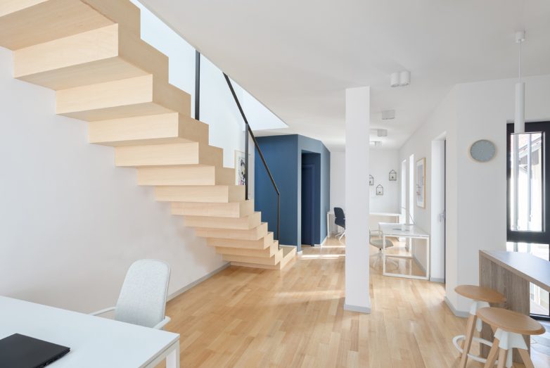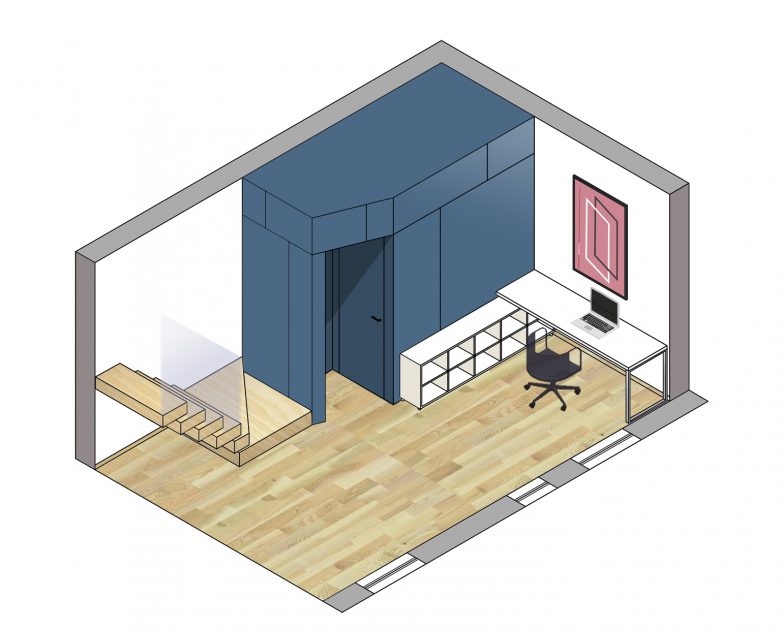 Donji nivoi dupleksa su tekući prostori, a u dnu svakog od njih je smeštena kao koloritno prostorni akcenat „plava kapsula“ sa servisnim funkcijama.