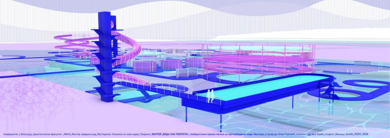 Milica Jočić: Naziv master rada je Filter – Voda kao pokretač. Projekat je proistekao iz analize kako kroz odabranu literaturu tako i putem opservacije okruženja i ljudi, kroz filter vremena u kojem živimo. Fokus savremenog čoveka više je okrenut ka ekonomskom napretku i novim tehnologijama, dok je priroda i ono čulno ostalo u senci svega toga. Sprovedeno istraživanje tokom semestra imalo je za cilj da otkrije i potencijalno reši probleme koji bi trebalo da postanu primat kada je u pitanju zdrav život i zdrava okolina. Aspekt u kojem je pojam filtera bio analiziran jeste osvešćivanje ljudi o važnosti mentalnog i fizičkog zdravlja uzimajući vodu kao glavni pokretač, a ujedno i problem. Shodno tome, rezultat jeste arhitektura koja je dvojaka: pogon za prečišćavanje vode – filter i relaksacioni centar – wellnes.