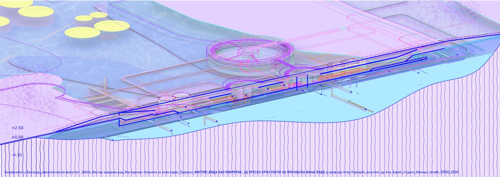 Milica Jočić: Naziv master rada je Filter – Voda kao pokretač. Projekat je proistekao iz analize kako kroz odabranu literaturu tako i putem opservacije okruženja i ljudi, kroz filter vremena u kojem živimo. Fokus savremenog čoveka više je okrenut ka ekonomskom napretku i novim tehnologijama, dok je priroda i ono čulno ostalo u senci svega toga. Sprovedeno istraživanje tokom semestra imalo je za cilj da otkrije i potencijalno reši probleme koji bi trebalo da postanu primat kada je u pitanju zdrav život i zdrava okolina. Aspekt u kojem je pojam filtera bio analiziran jeste osvešćivanje ljudi o važnosti mentalnog i fizičkog zdravlja uzimajući vodu kao glavni pokretač, a ujedno i problem. Shodno tome, rezultat jeste arhitektura koja je dvojaka: pogon za prečišćavanje vode – filter i relaksacioni centar – wellnes.