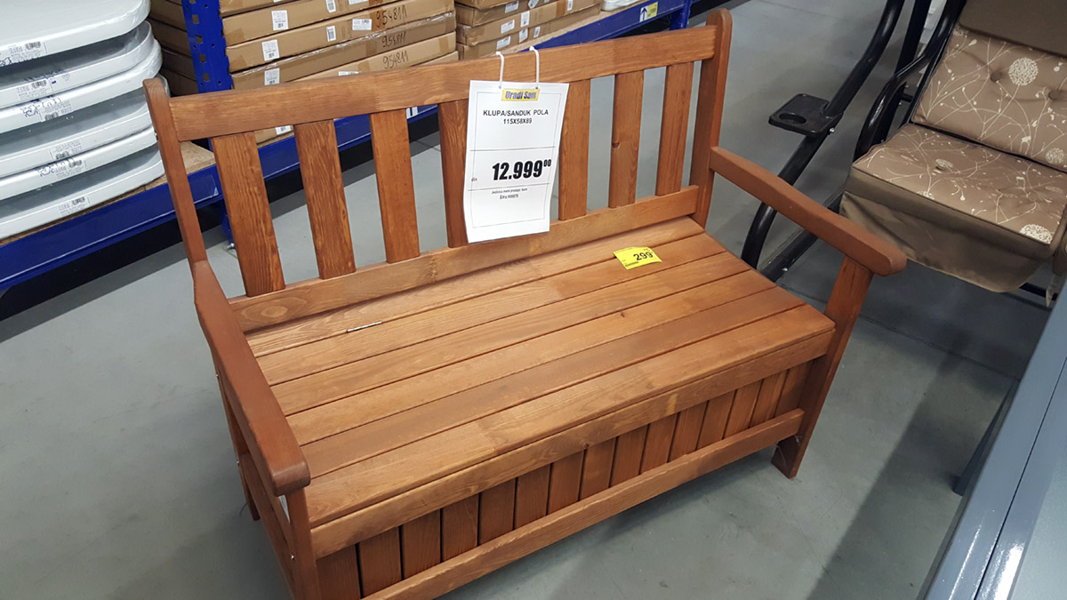 Ljubiteljima prirodnih materijala sigurno će se svideti ova drvena klupica s kutijom za odlaganje ispod sedalnog dela. Sonja smatra da bi lepo izgledala kada bi se prefarbala u belu boju i kada bi se postavili interesantni jastuci. Dimenzije klupe su 115x58x89 centimetara.
