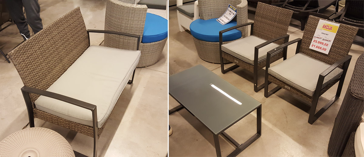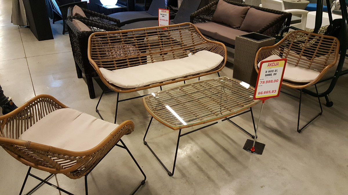 U prodavnici Metro pronašli smo ovaj set sa dve fotelje, klupom i stolom. Set izveden od bambusa sa metalnom konstrukcijom, deluje dosta kvalitetno i lagano pa je zato zapao Sonji za oko.