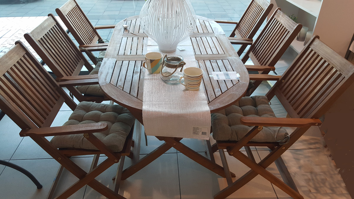 Klasičan trpezarijski baštenski set od drveta sa sklapajućim stolicama pronašli smo u Home Plusu.