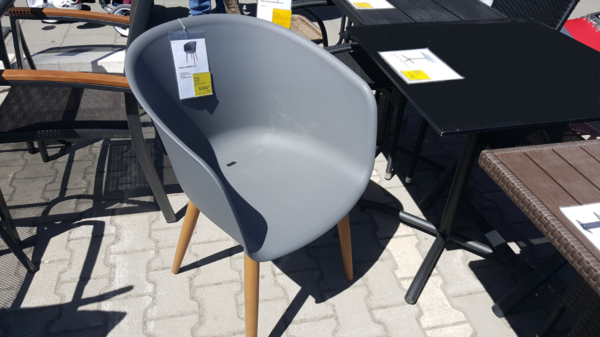 Još jedna lepa stolica za terasu od plastike, bez jastuka, jeste model Varming u dimenziji 59×56 H=81 cm. Mana ove stolice jeste što na sivoj mat plastiic ostaju vidni tragovi prašine.