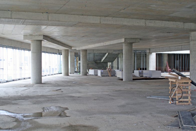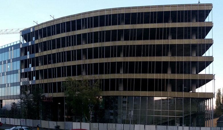 Masivna betonska konstrukcija od 29.000 kvadrata prati krivinu raskrsnice uz kaskadno povećanje spratnosti. Sa spratnom visinom od 4,20 metara, ova šestospratnica je ekvivalent zgradi od deset etaža. U najupečatljivije radove spada izrada fasade od staklenih elemenata različitih dimenzija, koji objektu uveliko daju razigran i dinamičan izgled. Veći deo fasade je postavljen, a uskoro se očekuje i zatvaranje kompletnog objekta.