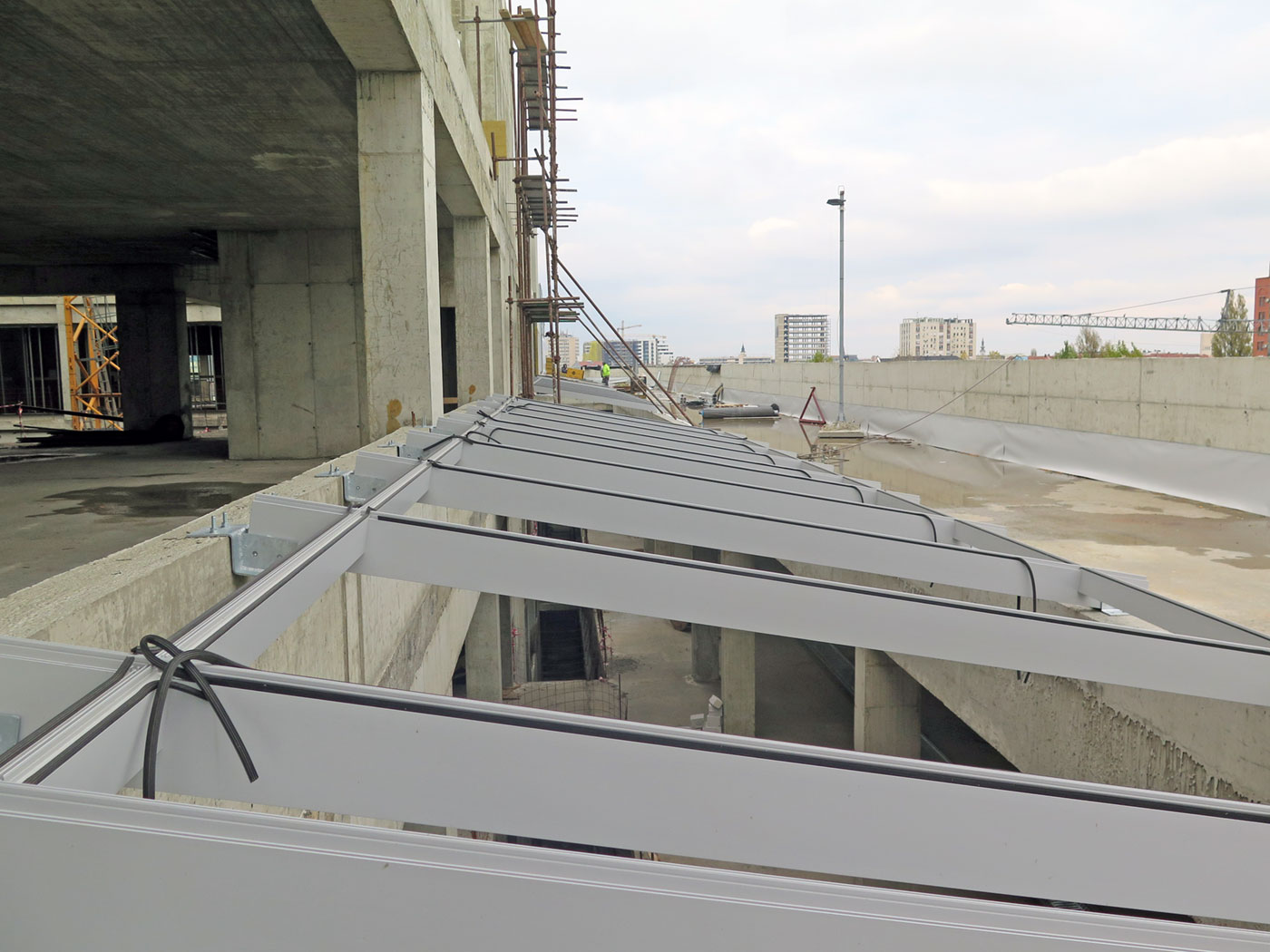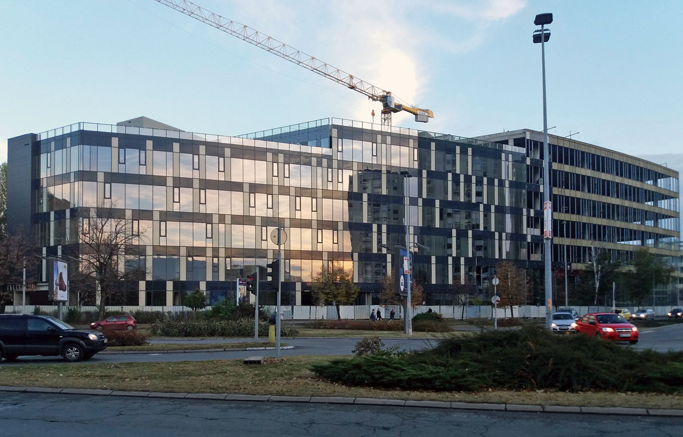 Masivna betonska konstrukcija od 29.000 kvadrata prati krivinu raskrsnice uz kaskadno povećanje spratnosti. Sa spratnom visinom od 4,20 metara, ova šestospratnica je ekvivalent zgradi od deset etaža. U najupečatljivije radove spada izrada fasade od staklenih elemenata različitih dimenzija, koji objektu uveliko daju razigran i dinamičan izgled. Veći deo fasade je postavljen, a uskoro se očekuje i zatvaranje kompletnog objekta.