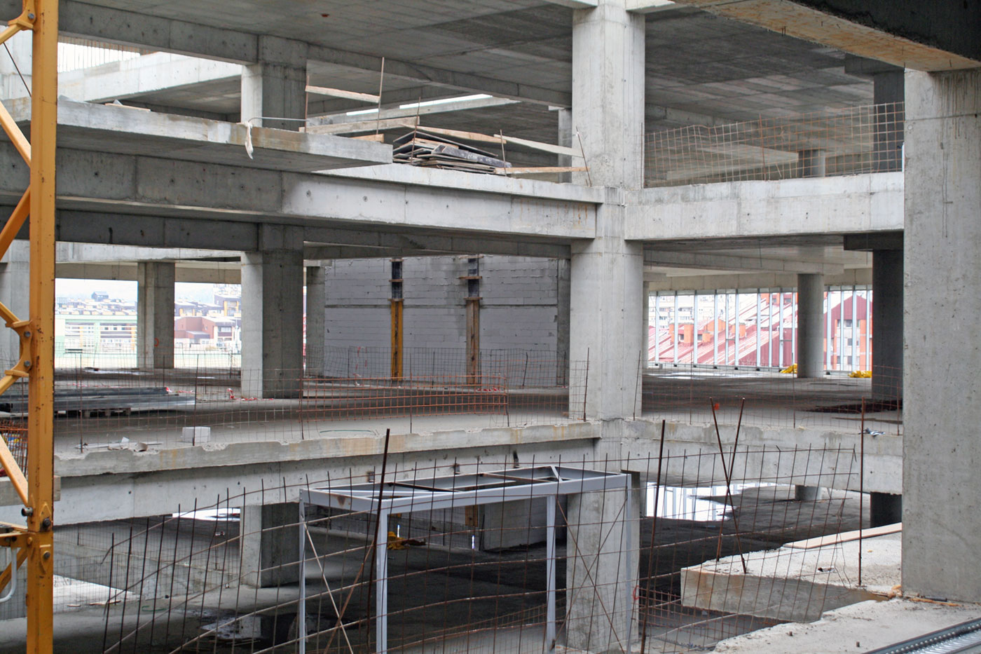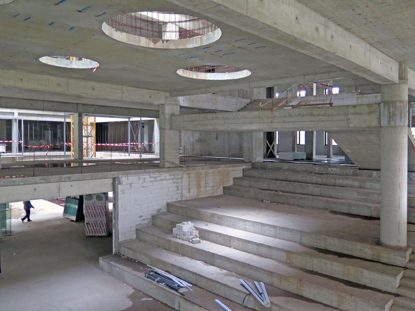 Pristup dnevne svetlosti u unutrašnjost ovog monolitnog zdanja omogućiće tri atrijuma. Podnožje jednog od njih čini perforirana tavanica prvog sprata, koja će biti prekrivena ojačanim staklom, tako da osvetljava prostrani hol s tribinama, u kojem se trenutno odvijaju radovi na staklenim portalima. Uporedo se postavljaju pregradni zidovi, ventilacioni vodovi, sistem za gašenje požara, električne i vodovodne instalacije.