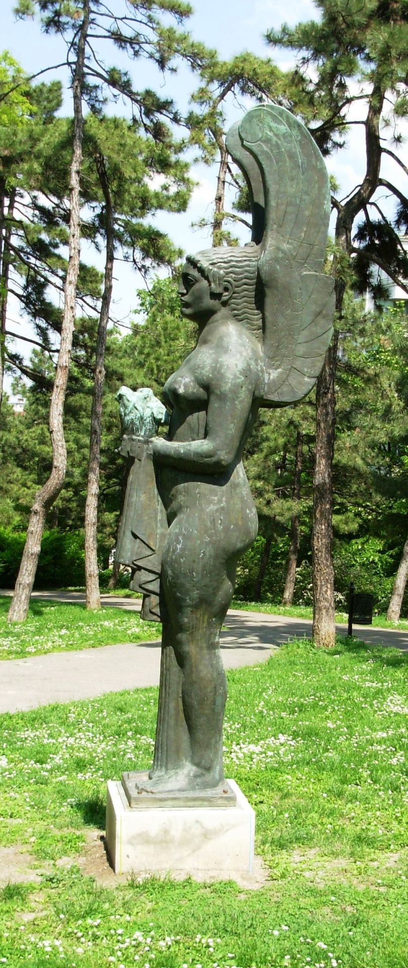 Autor zgrade je ruski emigrantski arhitekta Roman Verihovski, a po istoričaru umetnosti Prof. Dr Milanu Prosenu, ova figura predstavlja grčku boginju Nike, boginju pobede. I zaista, kada se malo bolje zagleda, krilata figura ima žensko telo i lik, ali i vojnički šlem, dok je u levoj ruci, koja je odlomljena, držala mač.