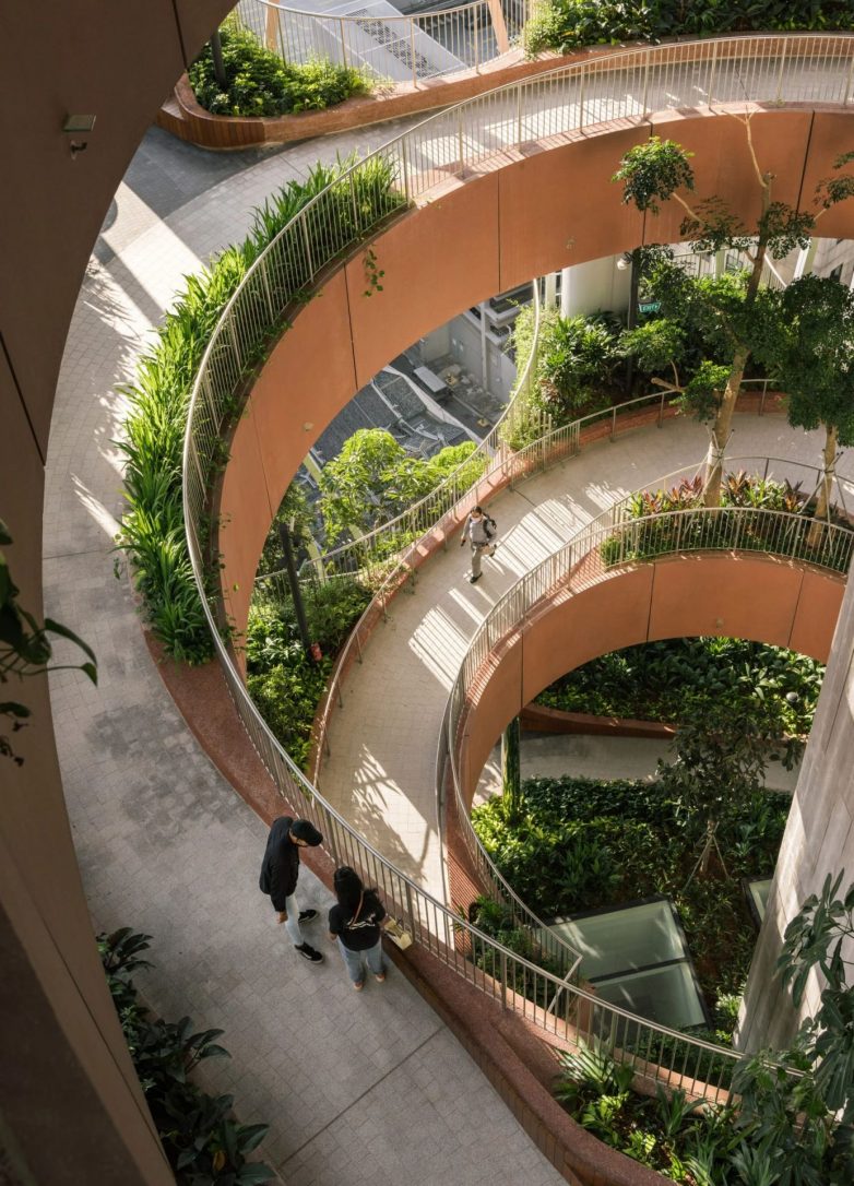 Četiri povezana nivoa su ispunjena spiralnim stazama i tropskim biljkama i drvećem, dizajniranim kao prostor za sve aktivnosti – od posla i događaja do opuštanja i vežbanja.