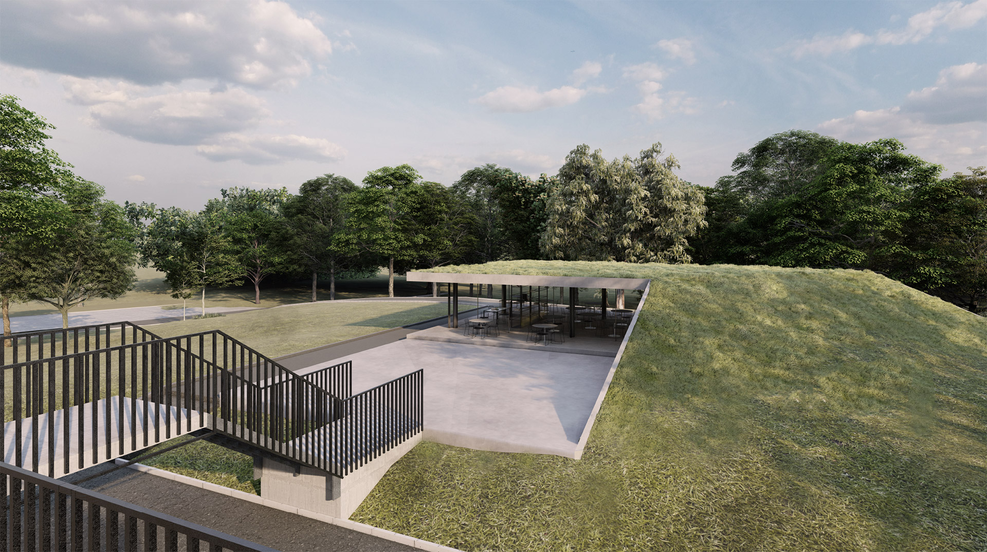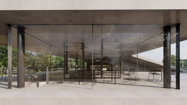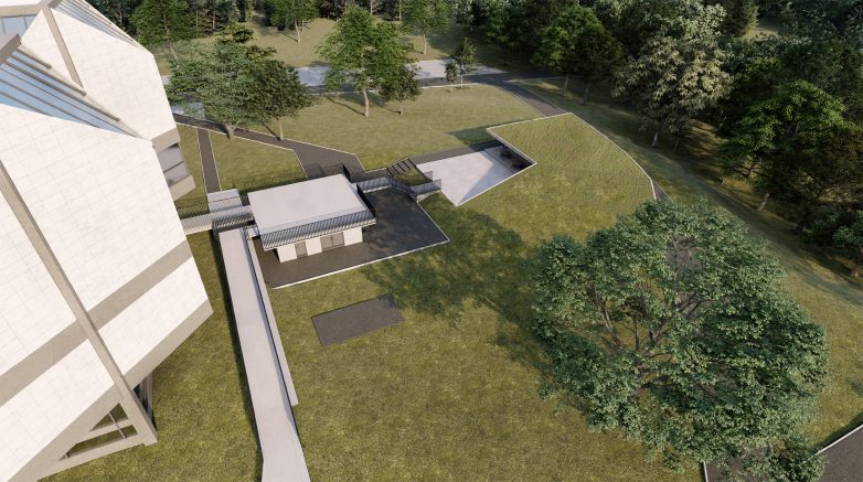 Oblikovno paviljon postaje ekstenzija već postojećeg parternog uređenja, tako da ne utiče na arhitektonsku volumetriju i proporciju muzeja. Funkcionalno pozicioniran na raskrsnici svih puteva i vizura na parceli, omogućio je stvaranje novih potcelina (trg, pozornica, tribine…).