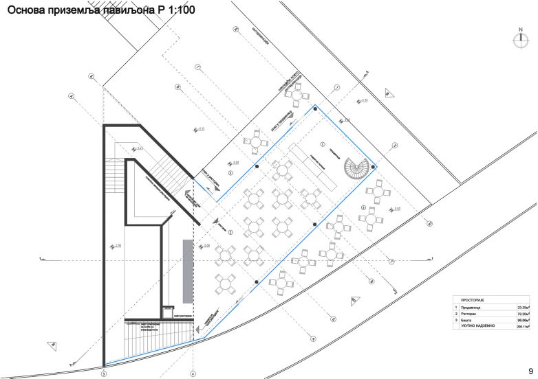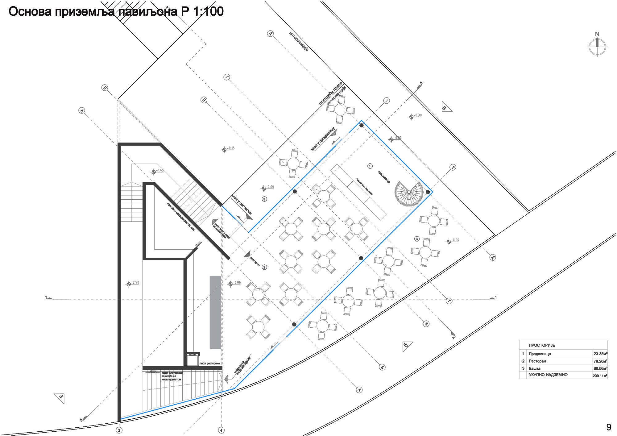 Prvu projektovanu programsku celinu čini paviljon sa komercijalnim sadržajima muzeja, podeljenim na ugostiteljstvo i trgovinu. Kafe-restoran i prodavnica projektovani su u jednom objektu – Paviljonu, sa svojim glavnim i pomoćnim prostorijama.