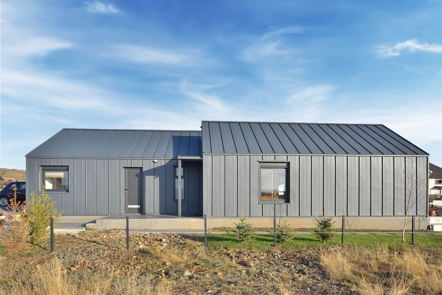 Na kontaktu dve površine (krova i zida), postavljen je fazonski element samog proizvođača, a na takav način da ova kuća nema oluka. Fazonski elementi postavljeni su i na slemenu, ali su iskorišćeni i za vetar-lajsne. Pored autentičnog izgleda, klijent je dobio fasadu o kojoj ne treba da brine i razmišlja pola veka.