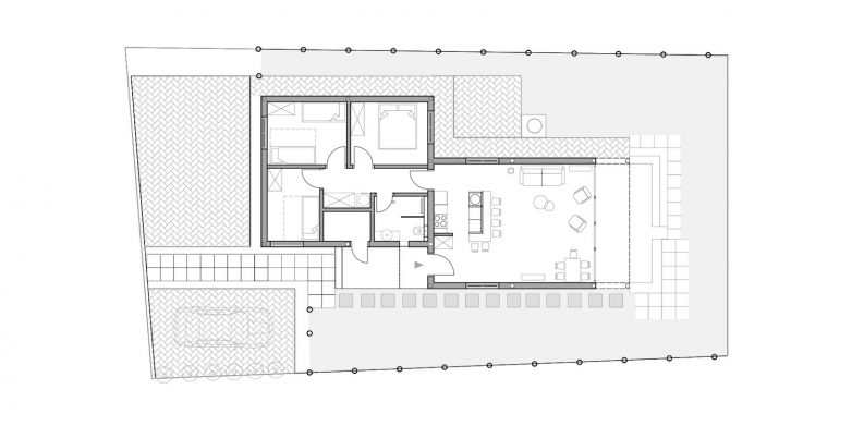Vikendica je projektovana tako da može istovremeno prihvati boravak 2 porodice sa 4 člana. Iz tog razloga, objekat ima 3 spavaće sobe, a spavanje je predviđeno i u okviru dnevnog boravka (u trenutku potpune posećenosti).