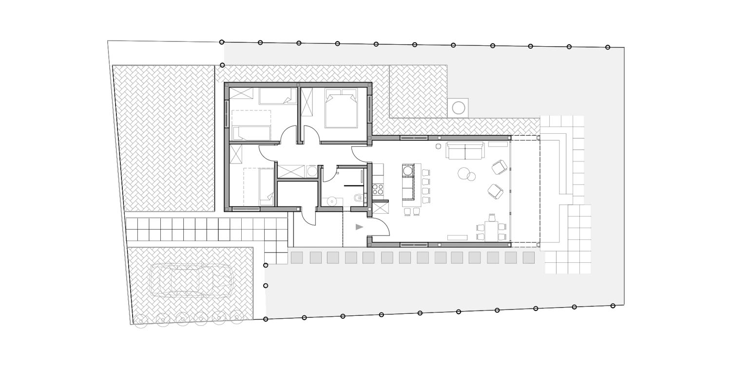 Baš iz tog razloga kuća je sagrađena na betonskom postamentu izlivenom na licu mesta i koji prati nepravilnu geometriju osnove. Kako je teren u blagom padu, postament se u zadnjem delu stepenasto spušta prema dvorištu, dok u prednjem formira pristup terasi.