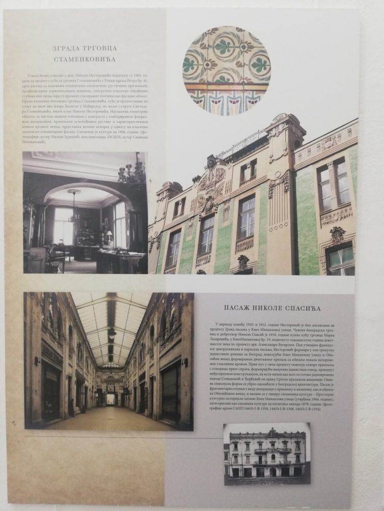 Od svih dela koja su na odličan način prikazana na izložbi, izdvojili bismo ona najreprezentativnija: zgrada Uprave fondova (1903), sedište druge po jačini državne banke, koju šira publika prepoznaje kao današnji Narodni muzej i zgrada Beogradske zadruge (1907), sedište najveće privatne banke, gde mu je na oba dela partner arhitekta Stevanović. Oba zdanja projektuju u total dizajnu, a uvode i značajnu inovaciju – armirano-betonsku međuspratnu konstrukciju, koja će u narednim godinama transformisati građevinsko-arhitektonsku struku.