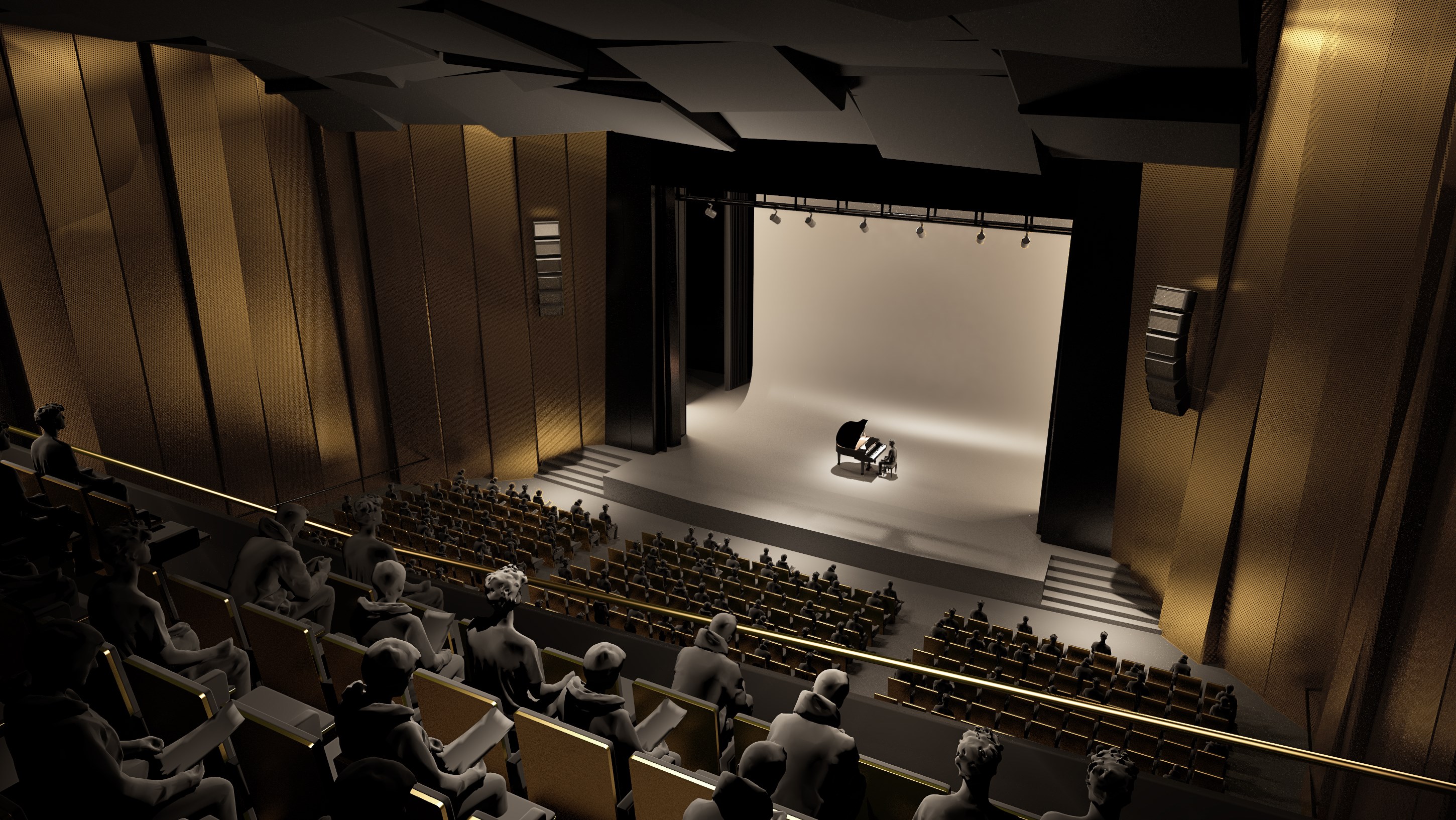 Enterijeri su rešeni praktično (u slučaju glavne pozornice po svim standardima akustike), u duhu funkcionalnog minimalizma, koji omogućava periodične transformacije za potrebe različitih događaja. I pored denivelacija donjih etaža, prisutan je u najvećoj meri otvoren plan, koji akcentuje dinamičnost i podstiče vizuelnu interakciju posetioca i aktuelnog sadržaja.