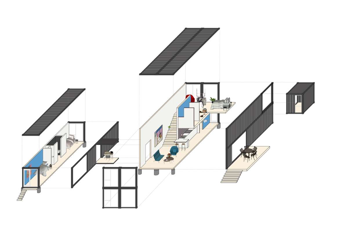 Imajući u vidu da su transportni kontejneri nešto uži nego što je potrebno za prostrane enterijere, arhitekte su po potrebi otvorile bočne, podne ili plafonske strane i međusobno ih spajale kako bi dobili željene volumene. Ovakvim sistemom omogućene su visoke tavanice u određenim delovima kuće, što pruža poseban efekat u enterijeru i veću prozračnost.
