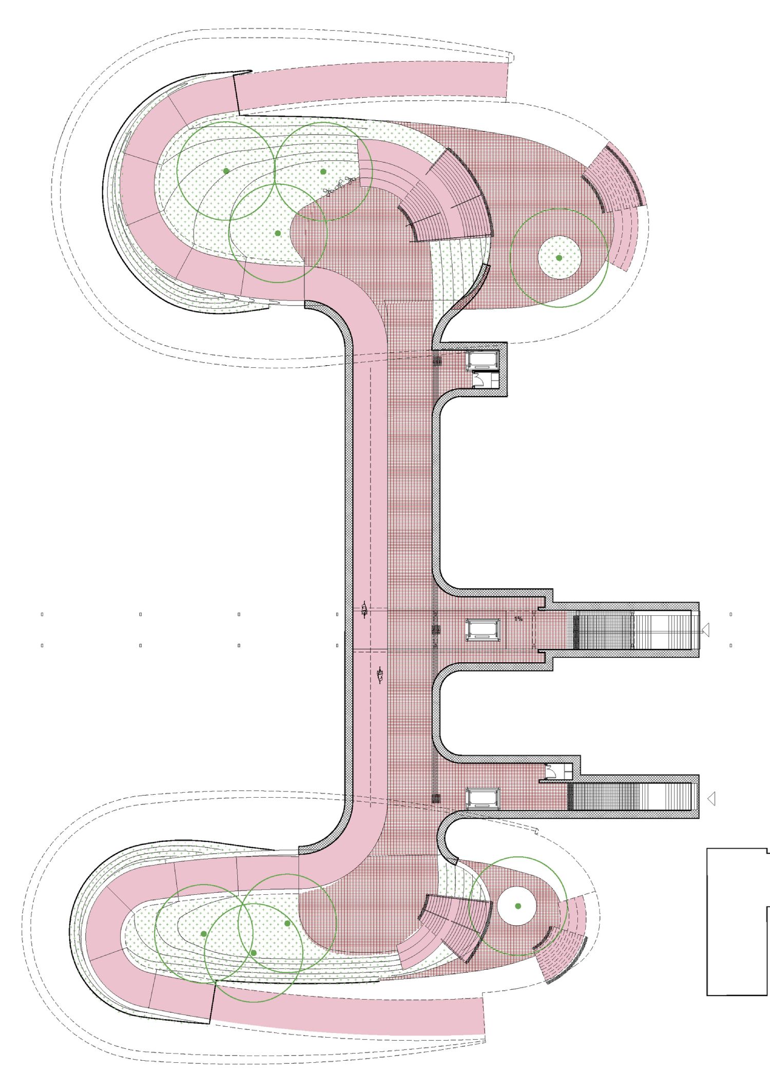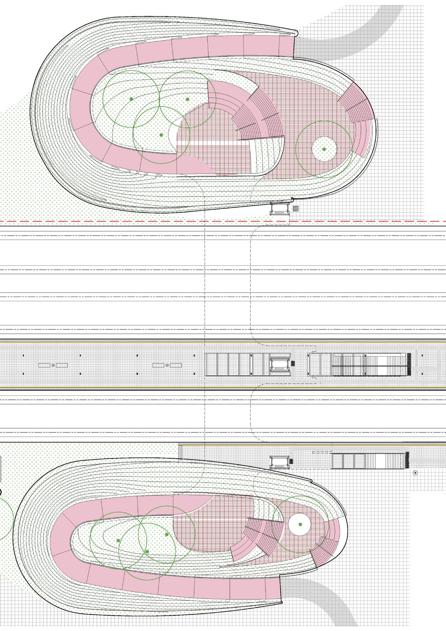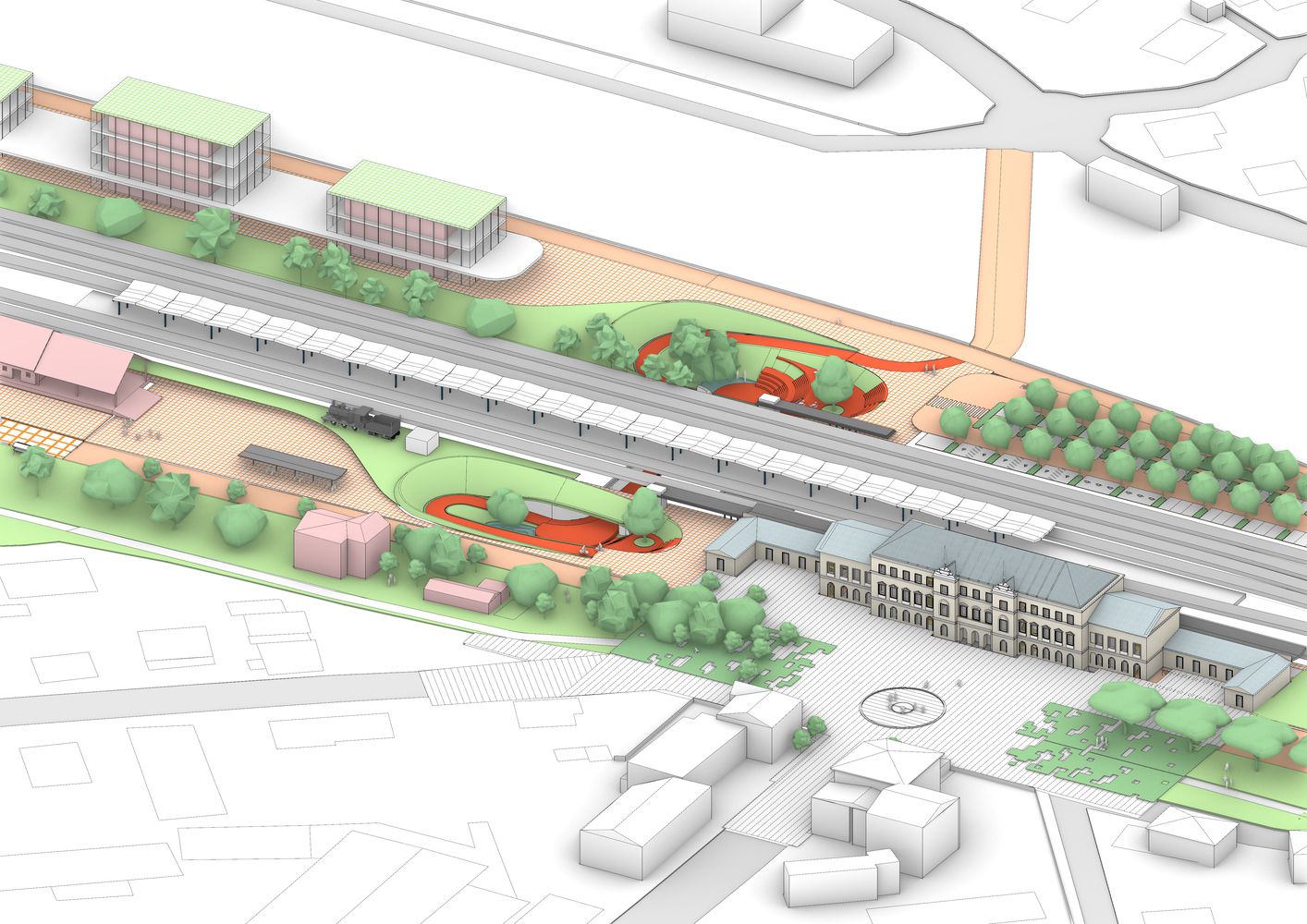Ova vibrantna podloga nastavlja se u zoni trgova, gde su uzlazne crveno-smeđe površine u kontrastu sa ozelenjenim padinama koje vizuelno ublažavaju intervenciju i unose element prirode.