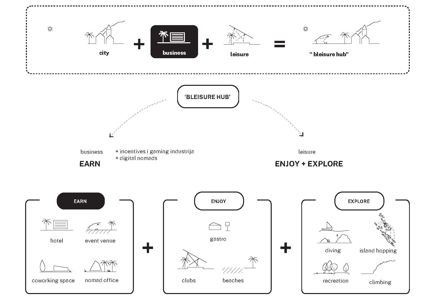 „Kako je trenutno najveći broj posetioca mlađe dobi, dodavanjem hubova, inkubatora i radnih prostora Novalja bi postala primamljiva destinacija za produženje sezone i boravka na tako atraktivnoj lokaciji. Posebno bi se mogla istaknuti kao žarište za gaming zajednicu ili digitalne nomade koji uz sport i aktivnosti, more i sunce, zabavu i provode, mogu podjednako naći prostore i uslove za rad“ – ističu mladi vizionari iz zagrebačkog biroa.