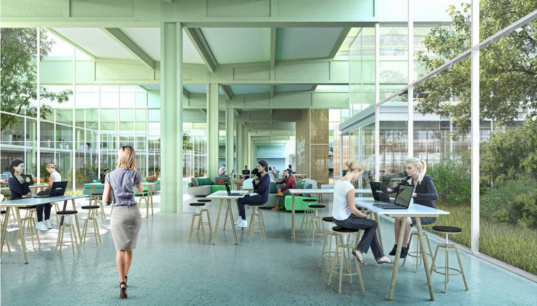 Celi prostor hale dodatno su oplemenili četiri unutrašnja atrijuma zamišljena i projektovana kao zelene otvorene bašte u kojima zaposleni mogu da provode pauze ili da rade. U centralnom delu je smešten amfiteatar koji se napaja iz središnjeg trga i koji kad nije u funkciji predavanja predstavlja njegov vertikalni produžetak.
