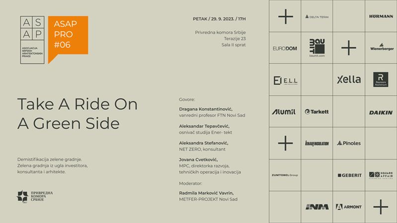 Nakon letnje pauze, Asocijacija srpskih arhitektonskih praksi nastavlja sa organizacijom svojih ASAP PRO događaja, te poziva javnost na stručni skup pod nazivom „Take A Ride On A Green Side – Demistifikacija zelene gradnje. Zelena gradnja iz ugla investitora, konsultanta za sertifikaciju i energetsku efikasnost, arhitekte“.