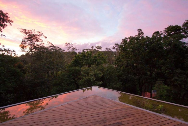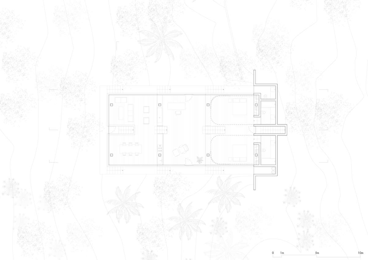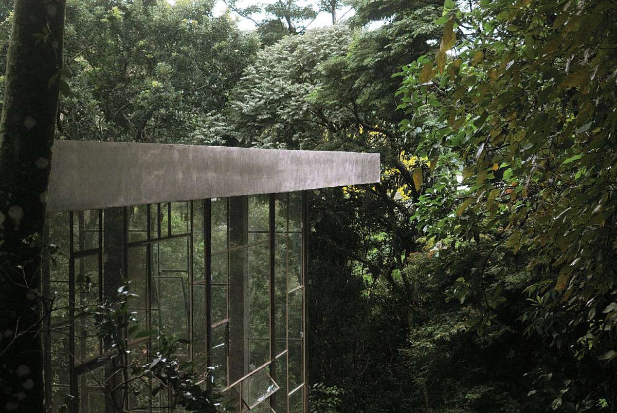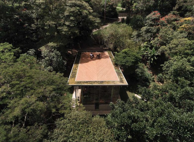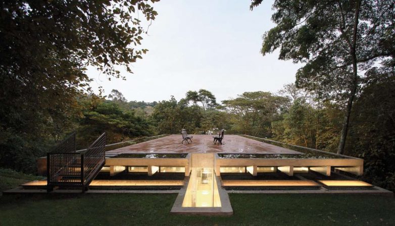 Prilazeći objektu saobraćajnicom, prvo što se uočava je ogromna drvena platforma postavljena na krovu betonske strukture, što stvara osećaj plutanja kuće među bujnom vegetacijom okolne prašume.