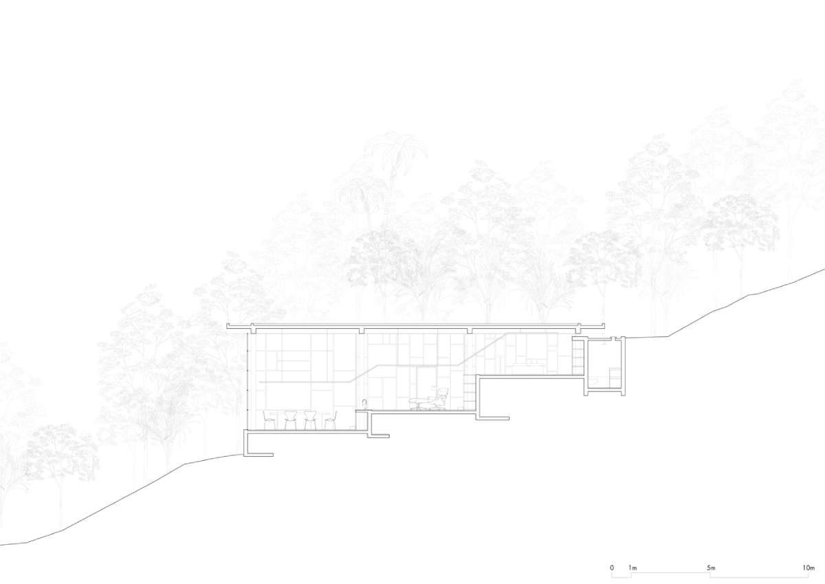 Arhitekte iz firme Atelier Branco Arquitetura dobile su zahtev od klijenta da se isprojektuje kuća u kojoj će on moći da u miru razmišlja i čita – potpuno izolovan od užurbanog gradskog života. Vlasnik kuće, preneo je arhitektama svoja maštanja o strukturi koja nije bila okarakterisana ni kao stalni dom, niti vikendica, već kao bujno i mirno mesto u koje se može povući. Projektanti su izašli s rešenjem koje je utopljeno u prirodu, ali tako da se objekat otvara prema šumi u dnevnoj zoni dok se u mirnoj zoni potpuno zatvara.