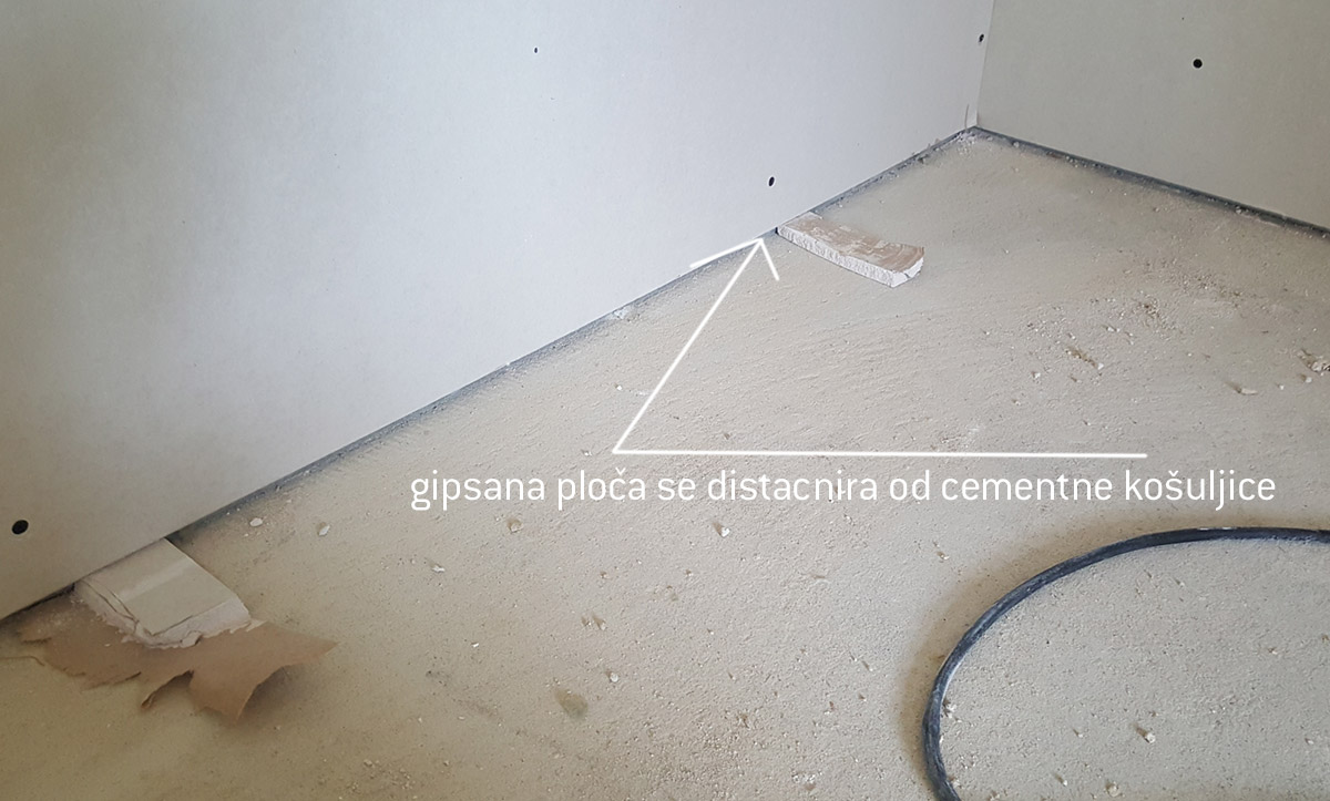 Sada na red dolazi postavljanje gips-kartonskih ploča da potkonstrukciju. Bitno je da ploče prilikom montaže odignu od poda, to jest, od cementne košuljice kako ne bi povlačile vlagu ali i kako bi dopuštale minimalne oscilacije. Ovaj prorez od oko 1 cm će kasnije da se popuni završnom podnom oblogom, odnosno, pločicama ili parketom. Ploče se fiksiraju za profile šrafljenjem. Šrafljenje se radi u razmaku od oko 25 cm dok je za plafone to oko 15 cm.