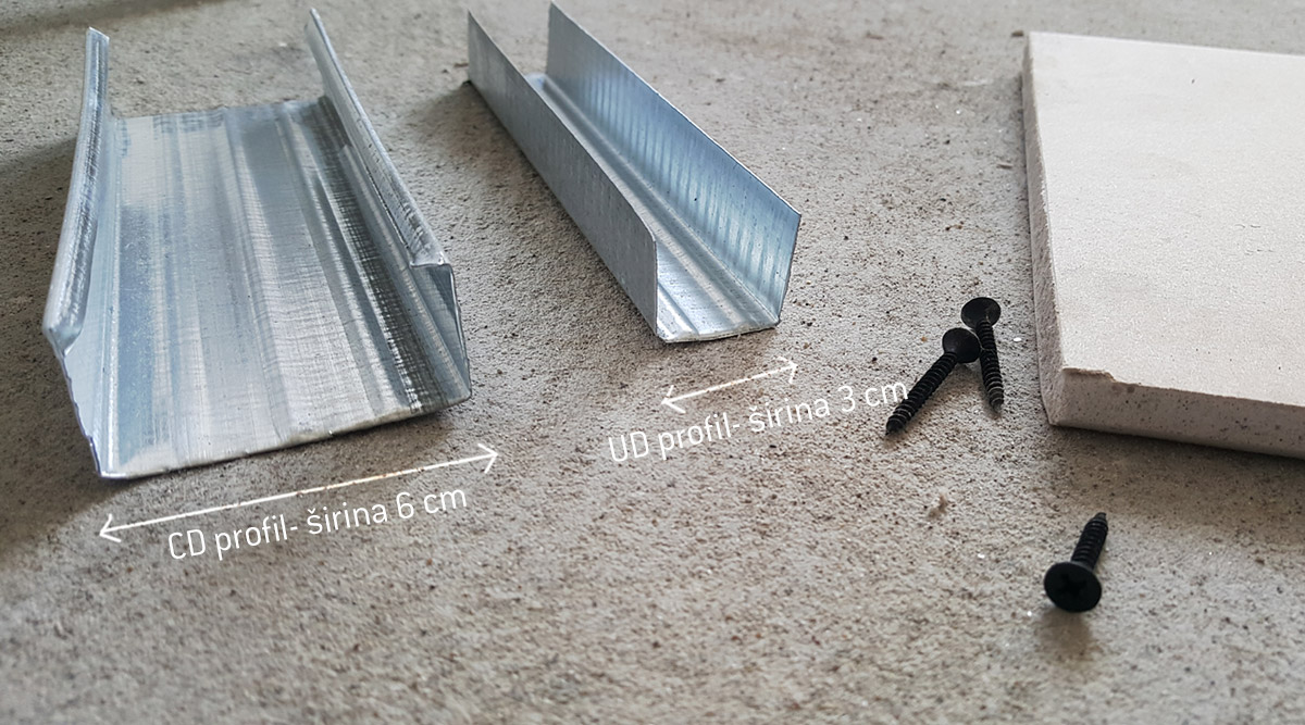 Za oblaganje zidova mogu se koristiti plafonski ili zidni profili. Mi smo u ovom slučaju koristili plafonske CD profile za vertikale i manji UD profil koji se postavlja na pod, plafon i krajnje ivice zida.