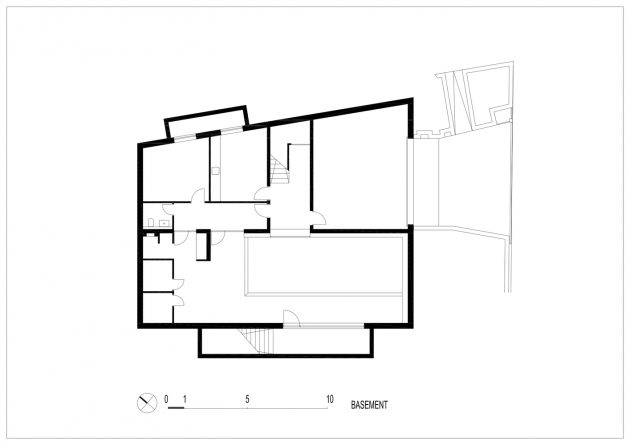 Kuća je podignuta od terena kako bi se dodatno kuća izolovala od komšilika. Dva nivoa kuće nalaze se iznad terena, dok je ispod terena garaža i bazen.