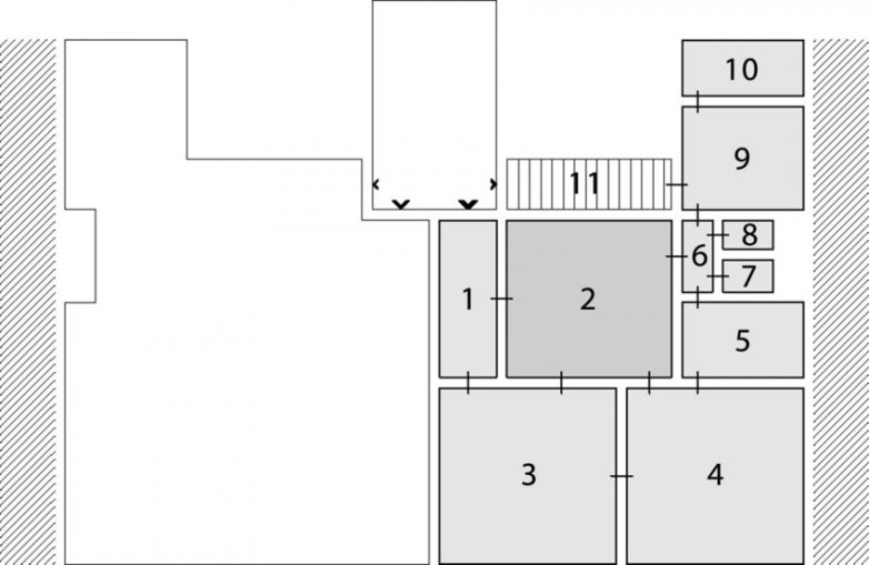 Karakteristični struktura salonskog stana sa servisnim blokom prema susednoj parceli. Namena prostorija: 1 – predsoblje ili ulazni hol, 2 – trpezarija, 3 – salon, 4 – soba, 5 – kupatilo, 6 – degažman, 7 – toalet, 8 – ostava, 9 – kuhinja, 10 – posluga (devojačka soba), 11 – lođa. Izvor: Alfirević i Alfirević-Simonović, 2017: 10)