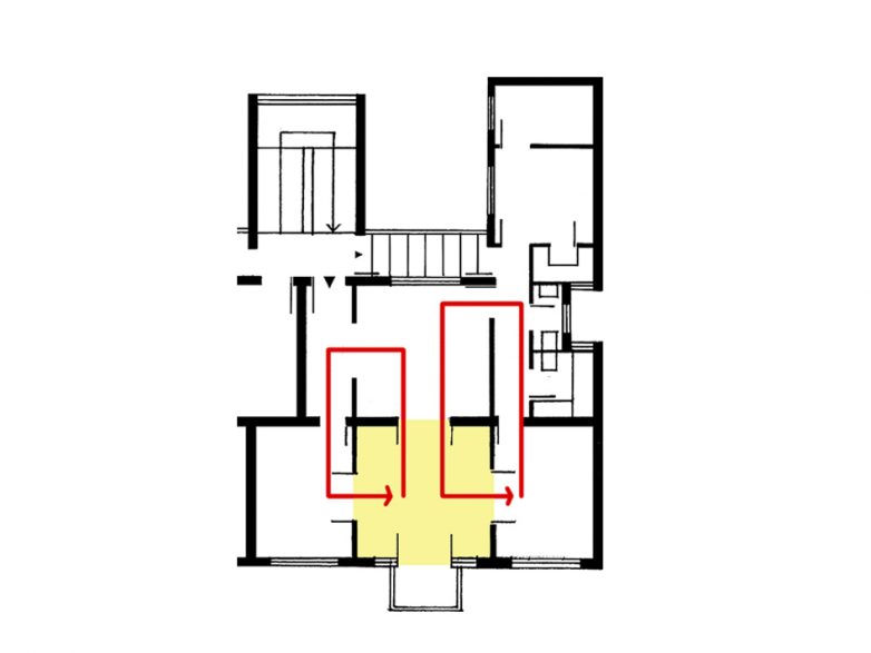 Pored glavnog ulaza u salonski stan, uvek je projektovan i pomoćni ulaz manjih dimenzija. Pomoćni ulaz za poslugu je preko terase ili lođe, na dvorišnoj strani stana, bio povezan sa servisnom zonom i devojačkom sobom. Ovom šemom kretanja izbegavala se mogućnost susreta posluge i gospode.