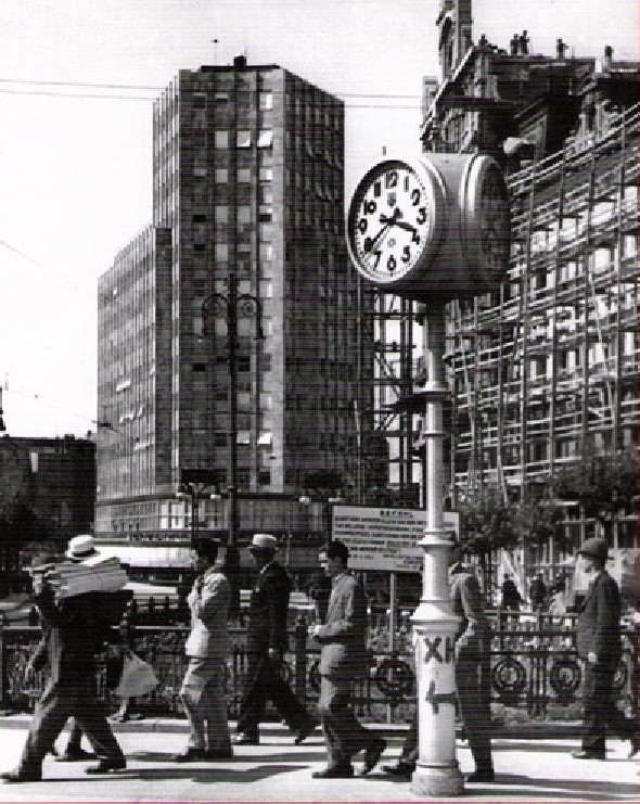 Prve satove imale su gradske kuće ili okružna načelstva, zgrade većih banaka i zgrade berzi. U suštini, svaki objekat čija funkcija je zahtevala, a prostorna pozicija omogućavala, dobijao je sat. Trg Republike, ranije Pozorišni trg, uobličavan je pre i posle Drugog svetskog rata. Dijagonalno od zgrade Uprave fondova (tada već Državna hipotekarna banka, posle Rata Narodni muzej), 1931. godine, po projektima arhitekte Ivana Belića, biva izgrađena Palata „Reuniona“.