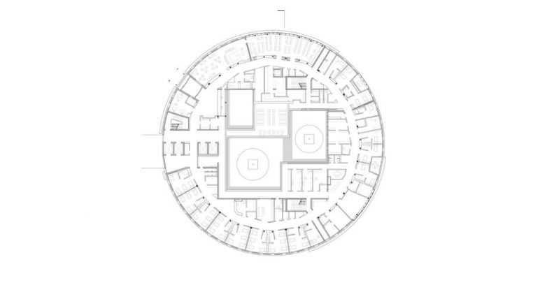 Sobe za pacijente su raspoređene po obodu kružne zgrade, kako bi u svakoj bilo dovoljno vazduha i prirodne svetlosti. Između soba su organizovane zimske bašte koje funkcionšu kao zajednički prostori.