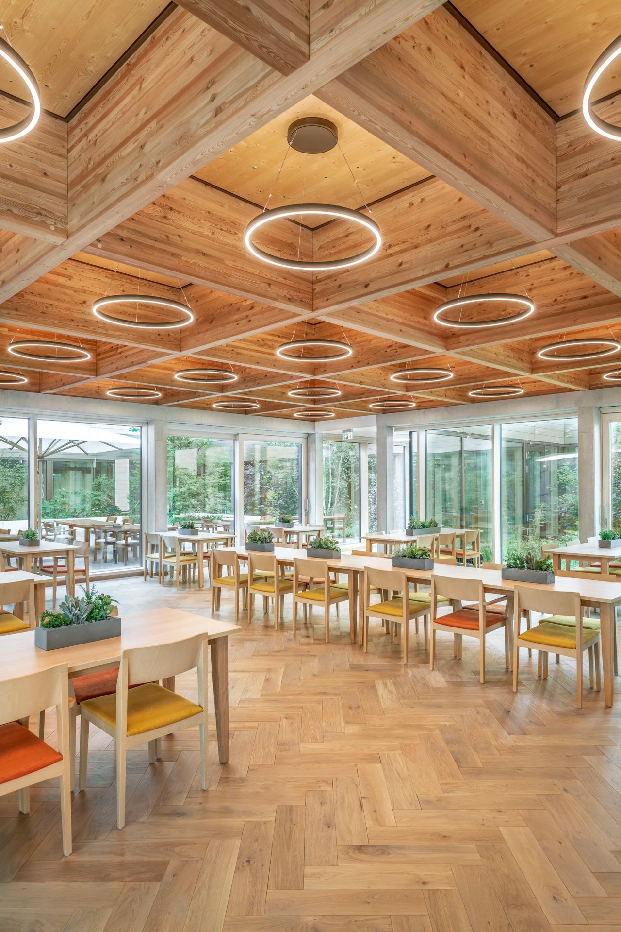 Drvo je generalno najzastupljeniji materijal u objektu, kako bi se postigao topao i umirujući osećaj tokom boravka u centru. Takođe, zeleni krovovi i dvorišta pojačavaju vezu sa okolnom prirodom.