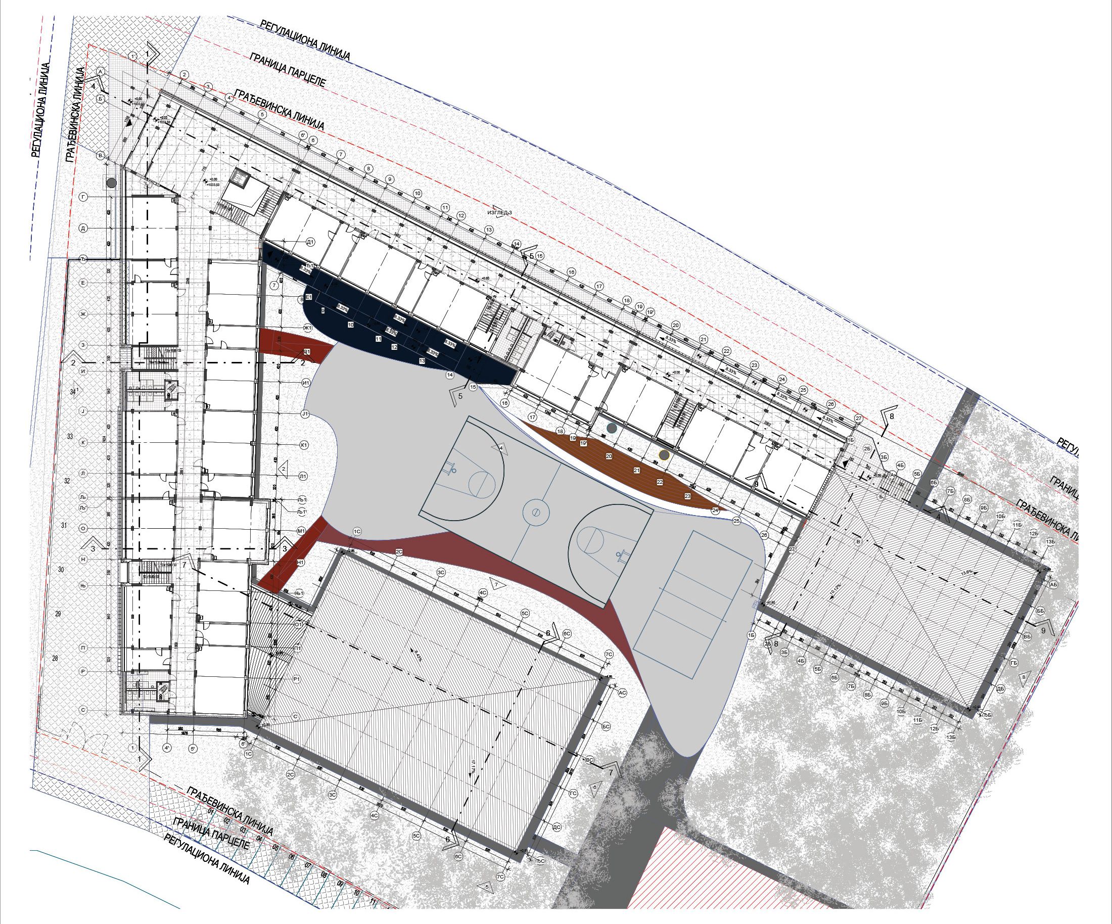 “Tri objekta – škola, fiskulturna sala i bazen, se formalno čitaju kao zasebni objekti iako se, spojeni toplim vezama, preklapaju i uranjaju u teren transformišući se u jedinstvenu funkcionalnu celinu. Motiv šume ukazuje na mir, kojem se suprotstavlja dinamičnost saobraćajnica koje okružuju lokaciju” – kaže Grahovac i nastavlja: