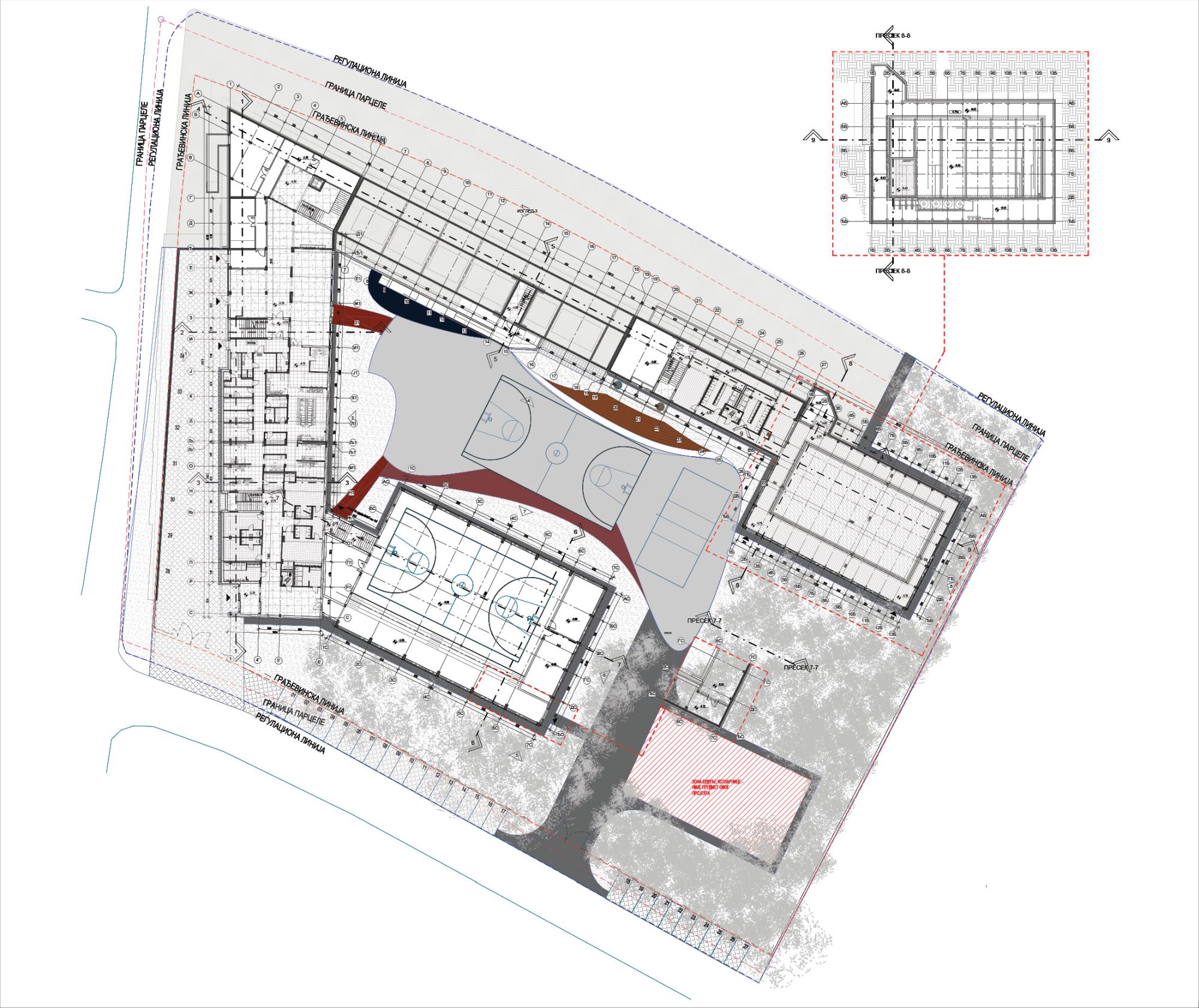 “Objekat sale otvara svoju uličnu fasadu ali krije svoje sadržaje dodatnom denivelacijom sportskog terena, a objekat bazena je u potpunosti zatvoren za okruženje i otvara se samo ka šumi. Sala i bazen su konstruisani od lepljenog lameliranog drveta pa se motiv šume i drveta čita i u unutrašnjem prostoru”, objašnjava sagovornik Gradnje.