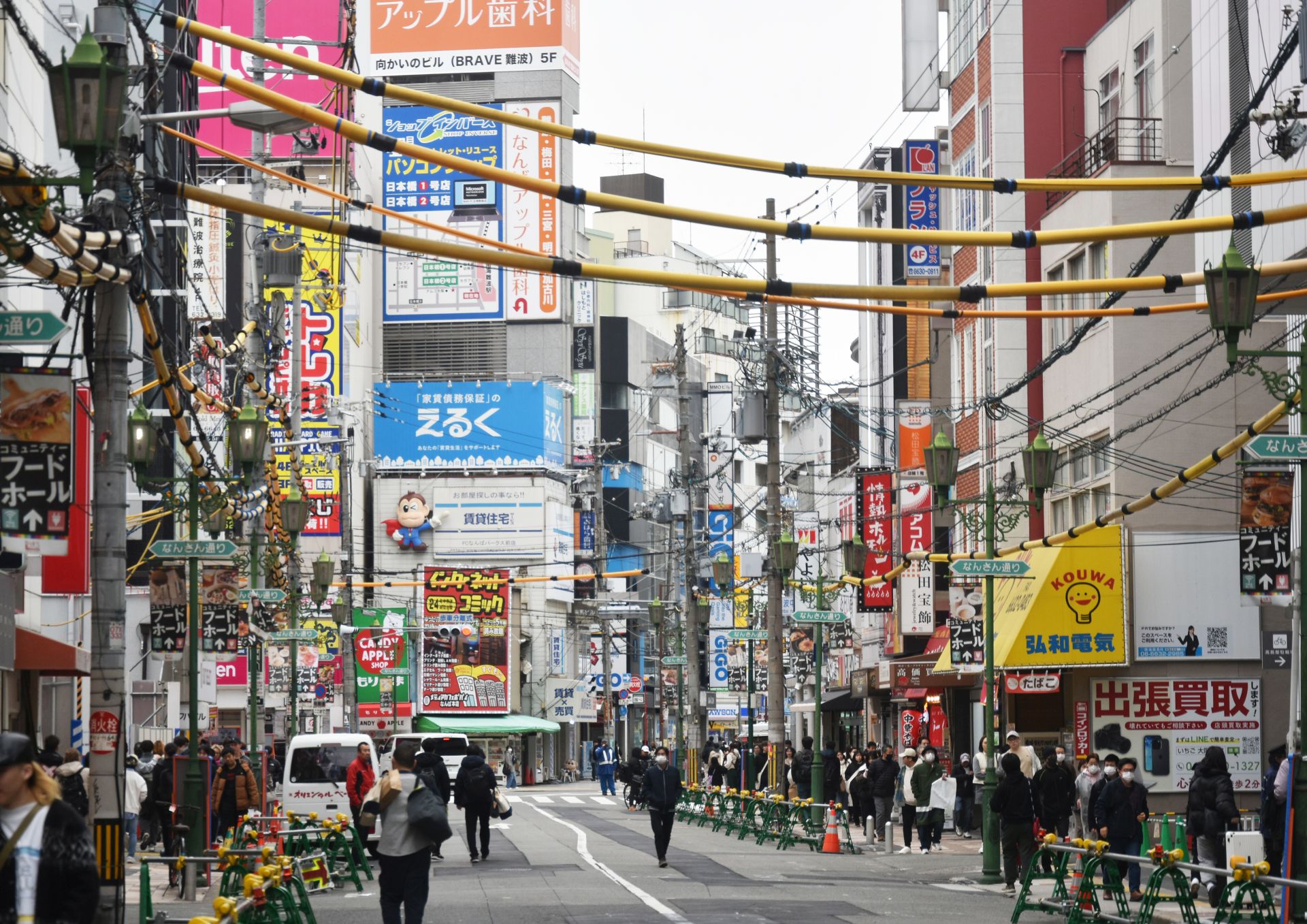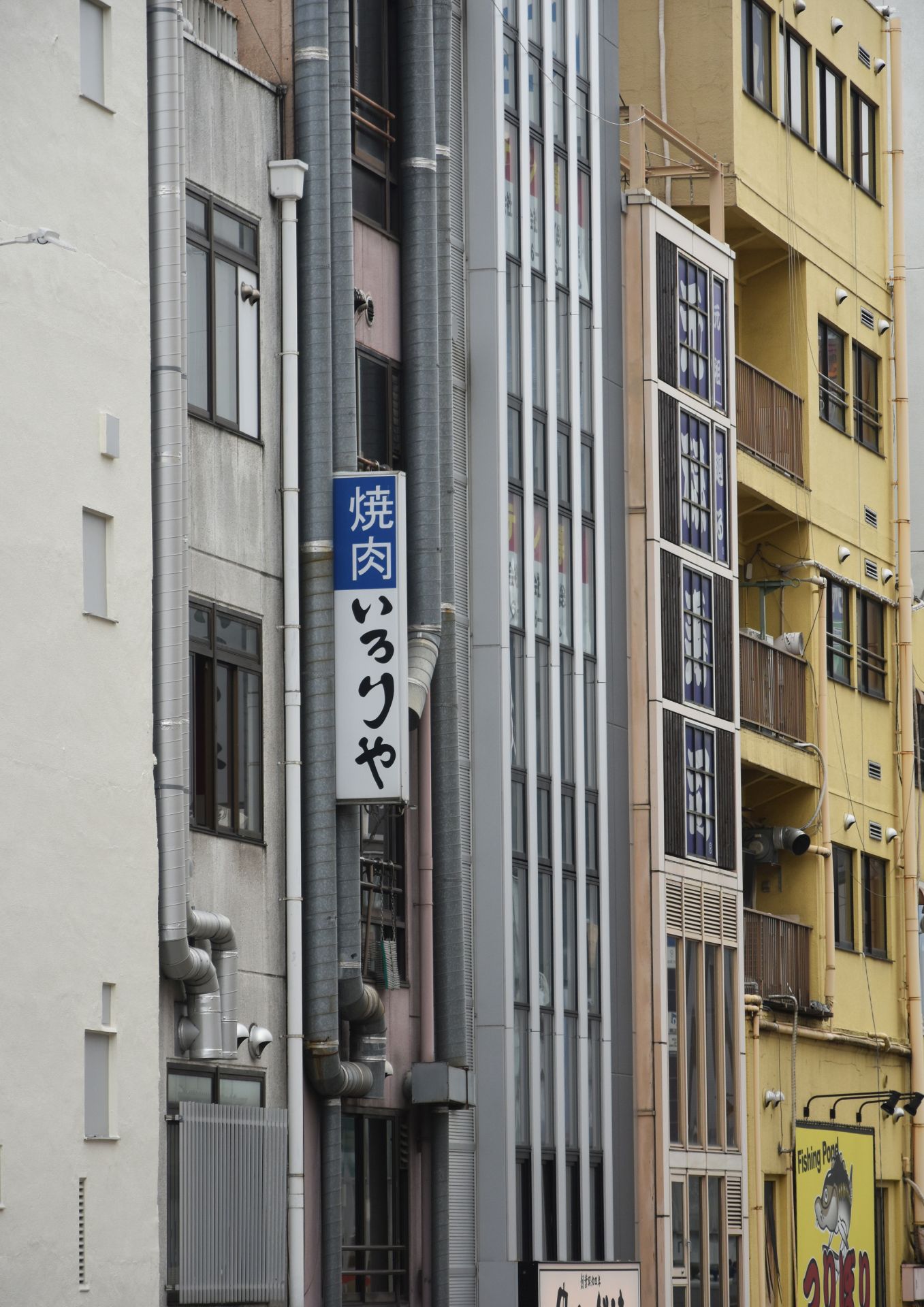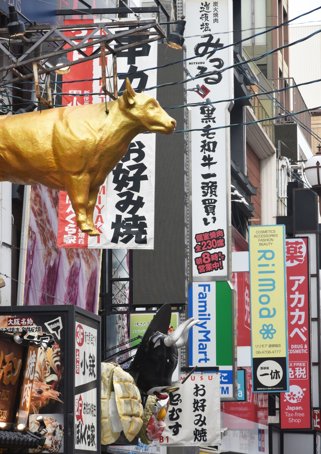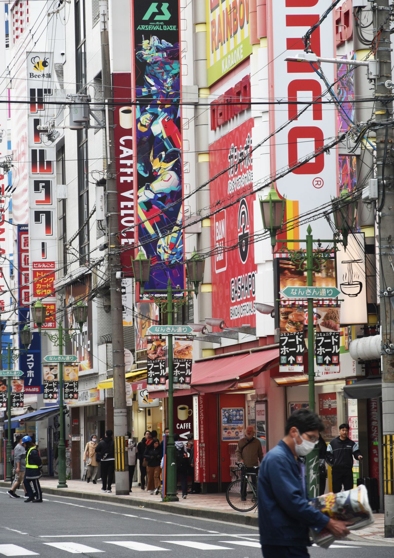 Tamni i prigušeni tonovi u centralnim kvartovima Namba i Dotonbori razbijeni su uličnim natpisima. Natpisi su predimenzionisani, drečavih boja i sa neonskim svetlosnim efektima. Mnogi restorani i prodavnice ističu svoju ponudu u obliku trodimenzionalnih figura. Na fasadama se mogu videti ogromni rakovi, hobotnice, porcije sušija i glava ljutog kuvara.