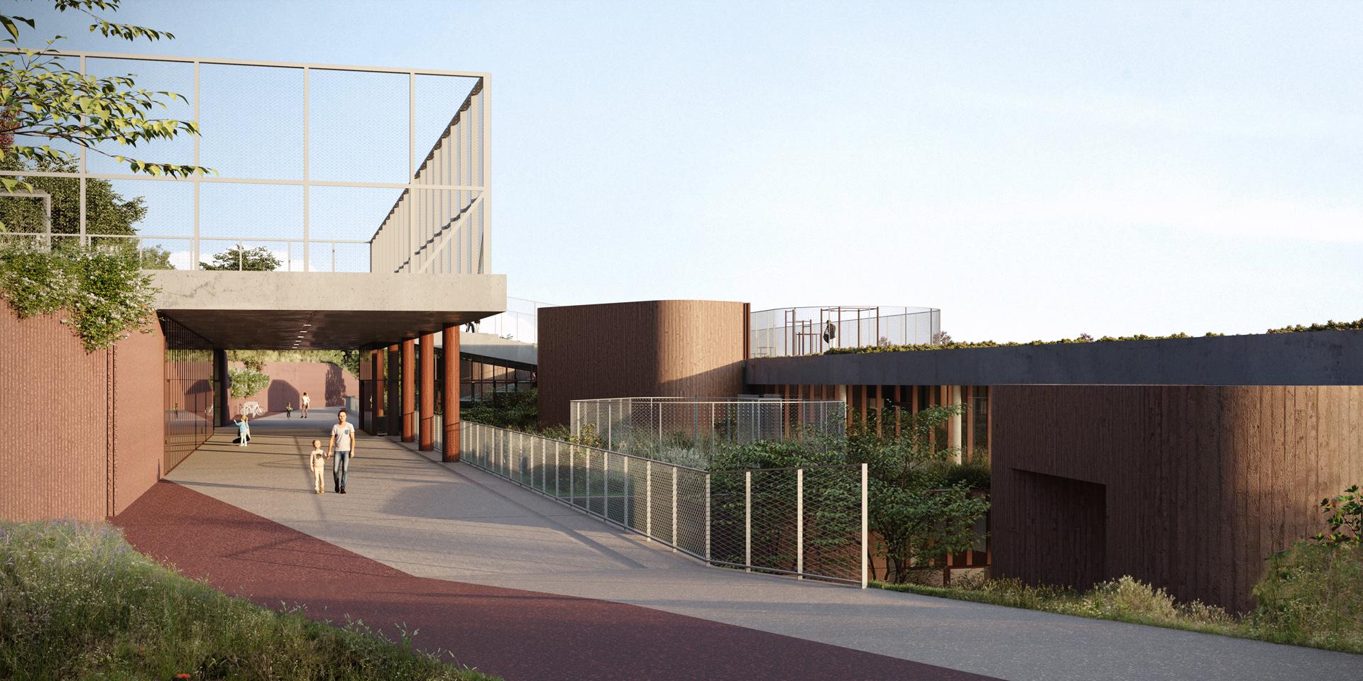 Dvoetažni volumen s učionicama podzemno je povezan s volumenom sportske dvorane, dok je sportsko igralište smešteno na krovu.