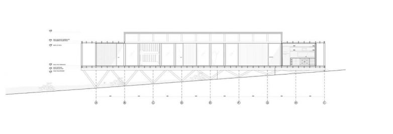 Objekat kubusne forme postavljen je na sistem kosih drvenih stubova, koji postaju viši kako se teren spušta, te je najviši stub visine 3,75 metara. Stubovi su, kao i fasadni zidovi i grede izvedeni od borovine, piše Dezeen.