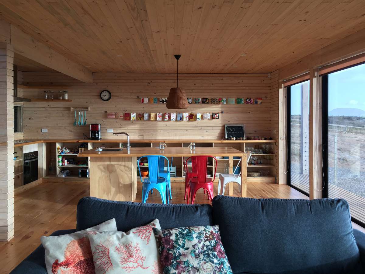 Objekat kubusne forme postavljen je na sistem kosih drvenih stubova, koji postaju viši kako se teren spušta, te je najviši stub visine 3,75 metara. Stubovi su, kao i fasadni zidovi i grede izvedeni od borovine, piše Dezeen.