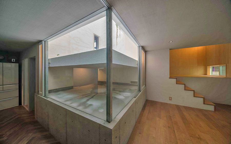 U dnu atrijuma ove japanske kuće formira se barica koju, kroz staklene zidove, možete posmatrati iz dnevne sobe.