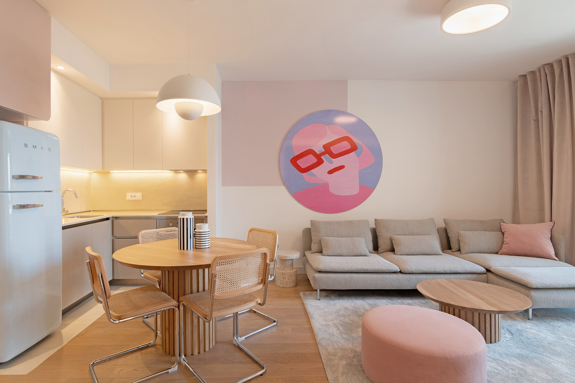 Bogatstvo kolorita, efektne slike, kao i zaobljeni frižider u boji, učinili su da se ovaj enterijer u Beogradu na vodi istakne u moru apartmana za izdavanje u prestonici, što predstavlja najvažniji zadatak za arhitektu kada se stan oprema za buduće zakupce.