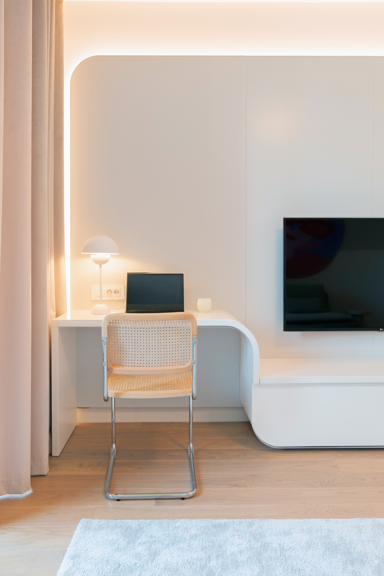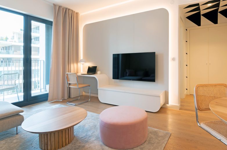 Po želji vlasnice stana, Brstina je osmislila i izvela interesantnu policu za TV u čijem sklopu je i radni sto – nenametljiv, a opet upečatljiv komad nameštaja.