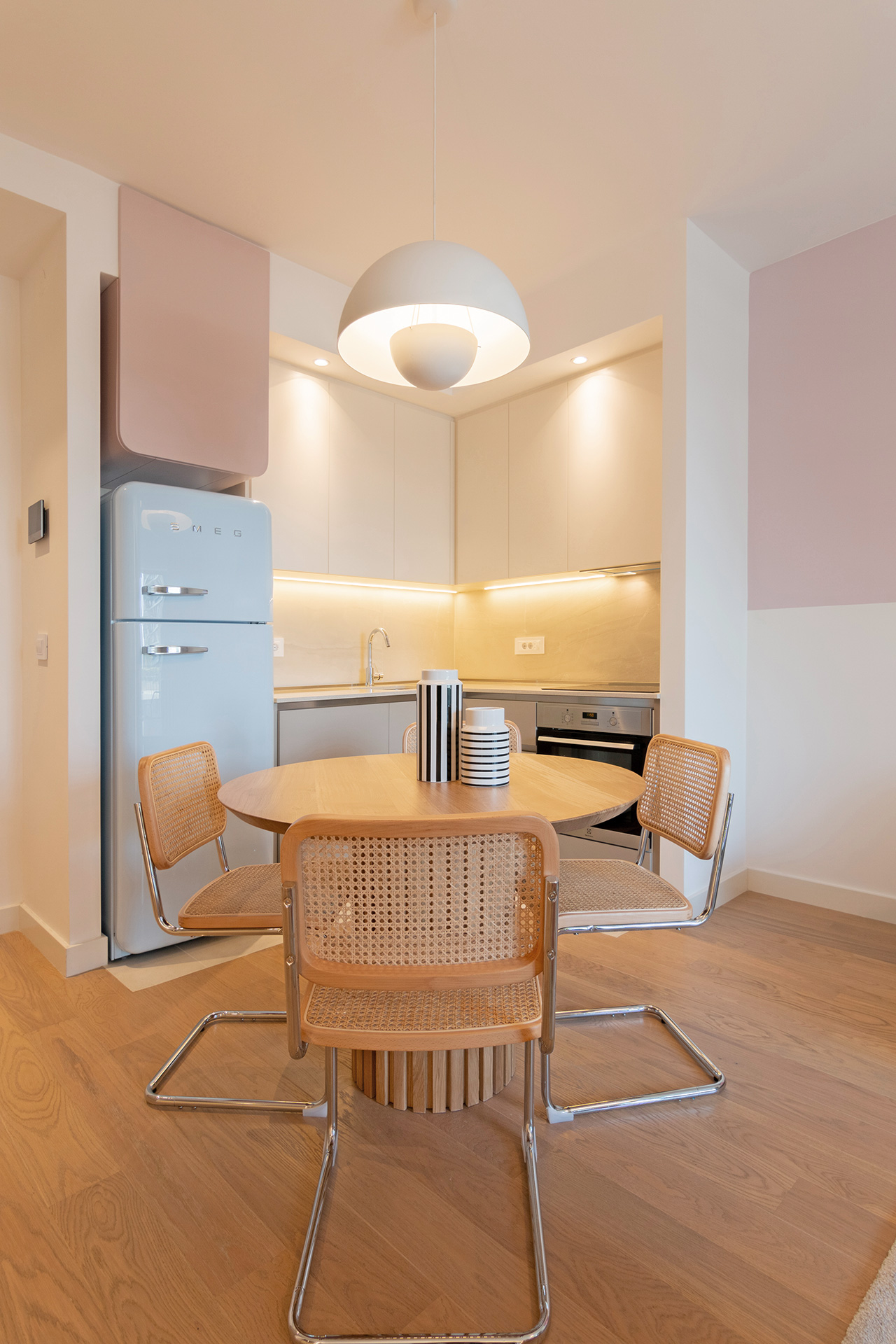Značajan deo budžeta Sonja je izdvojila za frižider Smeg u plavoj boji koji je, kako kaže, postao zvezda kuhinje, sa roze policom iznad koja prati njegovu širinu i formu.