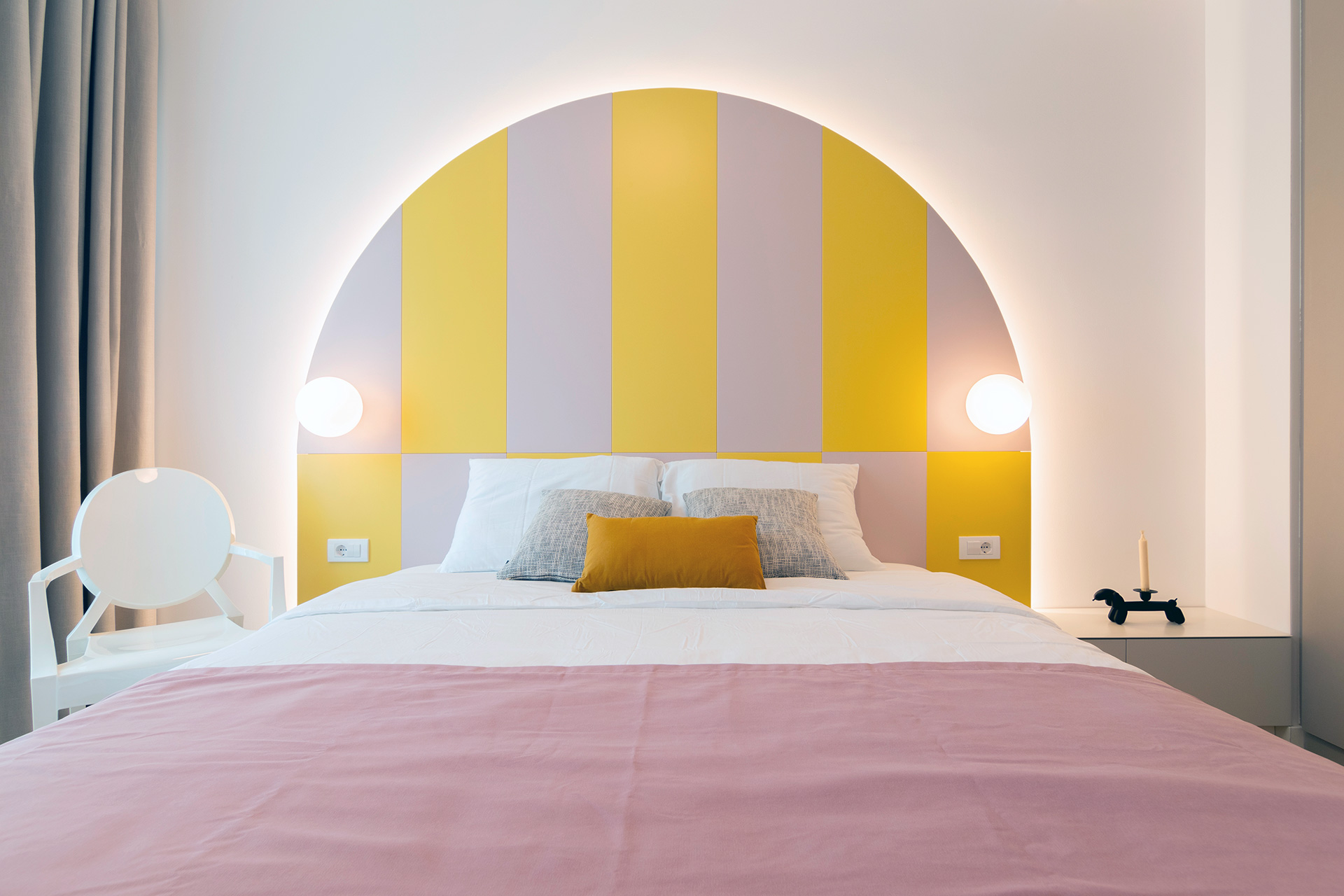U spavaćoj sobi dizajnerka enterijera koristila je ljubičastu i žutu boju na velikom polukružnom uzglavlju od MDF-a koje se prvo primeti na ulasku u ovu prostoriju.