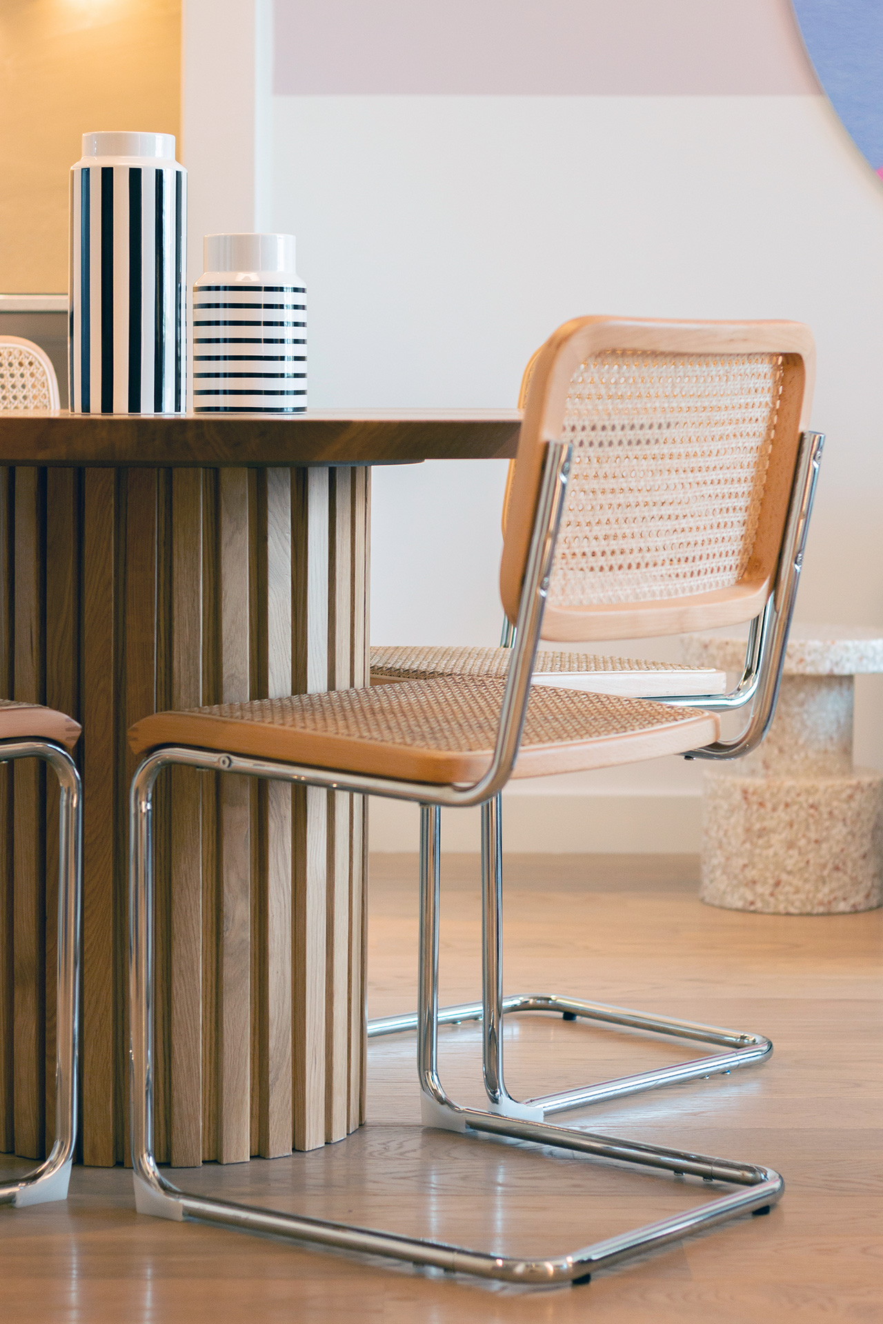 Tu je i kružni trpezarijski sto od punog drveta, kome su pridružene trpezarijske stolice od španske trske, dok je iznad njega postavljen efektan kružni luster Flowerpot.