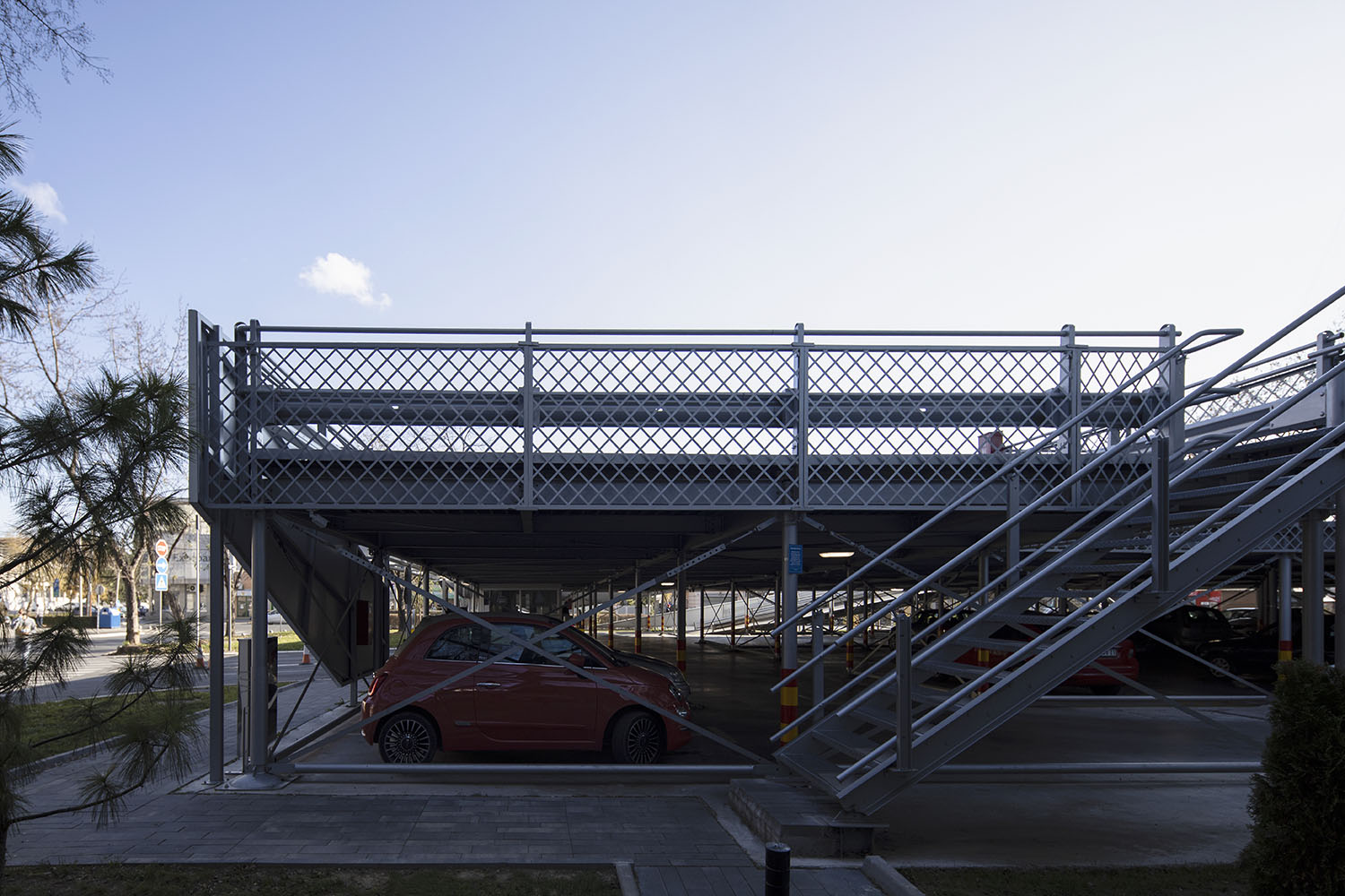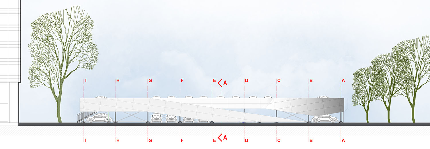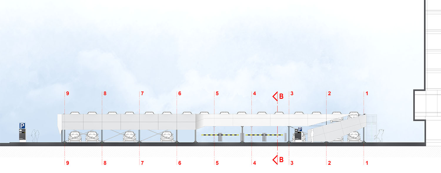 Do druge etaže dolazi se dvema rampama za jednosmerno kretanje vozila, maksimalne širine 5,0 m i nagiba 15%. Na gornjoj etaži omogućeno je parkiranje 63 vozila, na parking mestima standardnih dimenzija. Do druge etaže vode i dva jednokraka stepeništa.